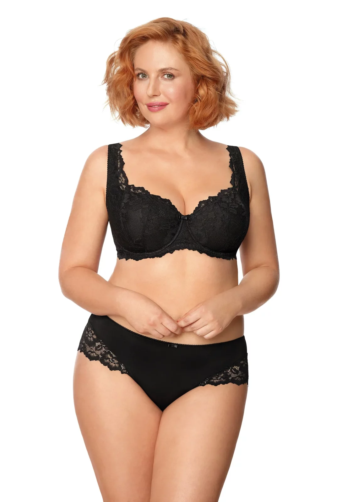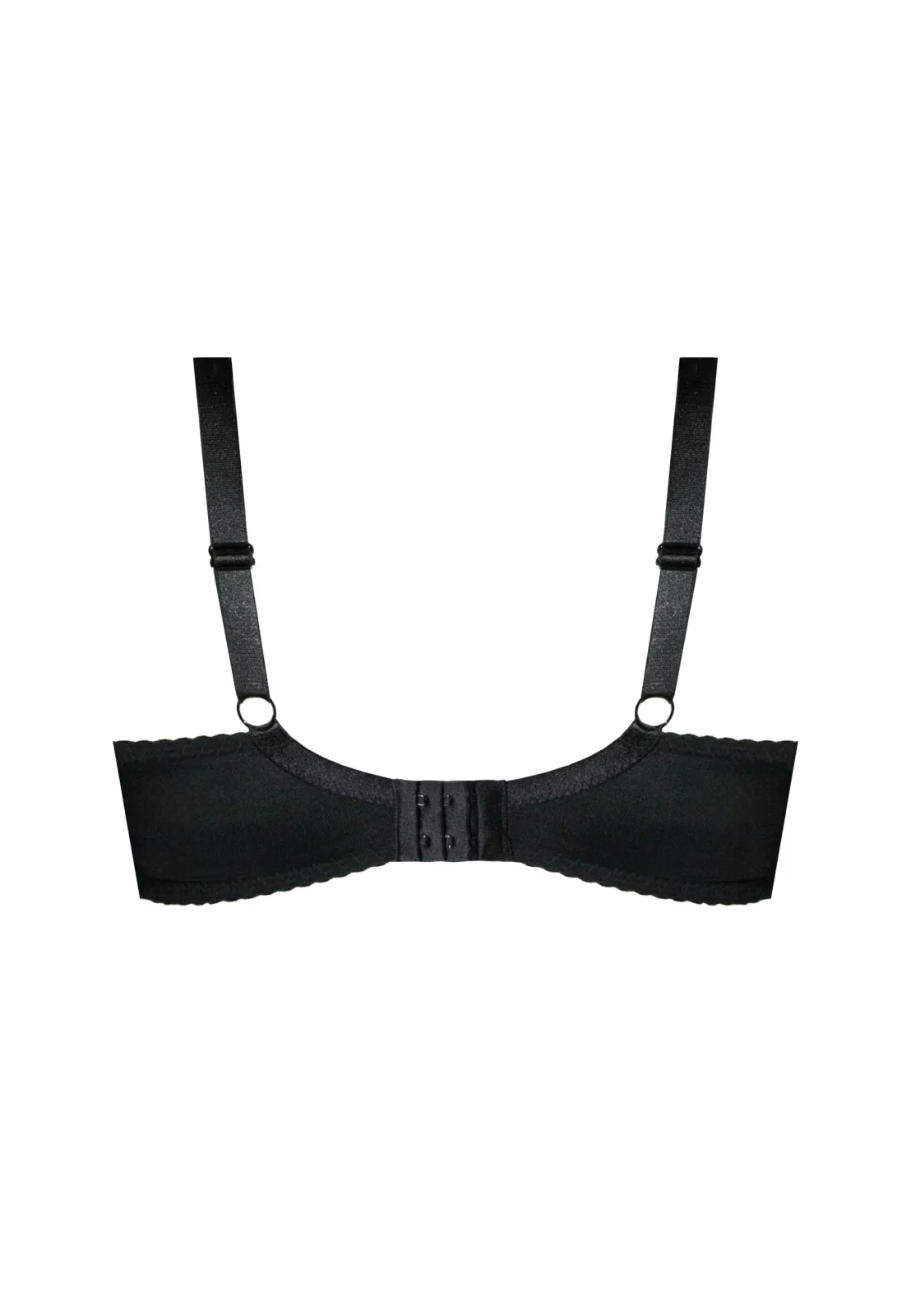 Miseczki biustonosza są usztywniane, dzięki czemu zapewniają doskonałe podtrzymanie i modelowanie biustu. Misterne koronkowe zdobienia nadają całości niezwykle kobiecego charakteru, a balkonetkowy fason subtelnie eksponuje górną część biustu, idealnie nadając się do głębszych dekoltów. Delikatny mostek ozdobiony subtelną kokardką dodaje całości uroku i elegancji.