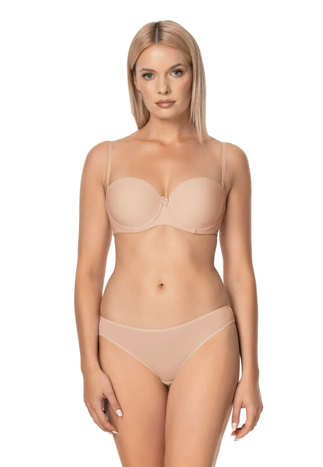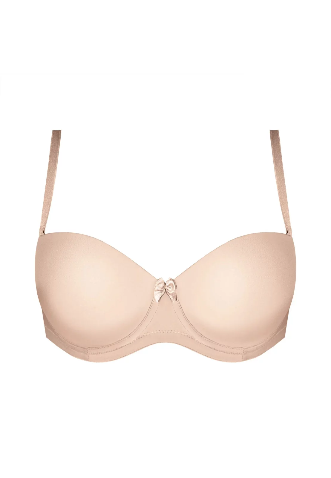 Gładkie, usztywniane miseczki o subtelnym wykończeniu pięknie modelują biust, nadając mu pełny i naturalny kształt. Dzięki uniwersalnej konstrukcji biustonosz doskonale sprawdzi się pod różnorodne stylizacje. Możesz go założyć do sukienek wieczorowych z odkrytymi ramionami, bluzek hiszpanek, a także topów z głębokim dekoltem. Jego minimalistyczny design i brak widocznych szwów sprawiają, że pozostaje niewidoczny nawet pod najbardziej dopasowanymi ubraniami. Model dostępny jest w dwóch bazowych kolorach: beżu i klasycznej czerni.