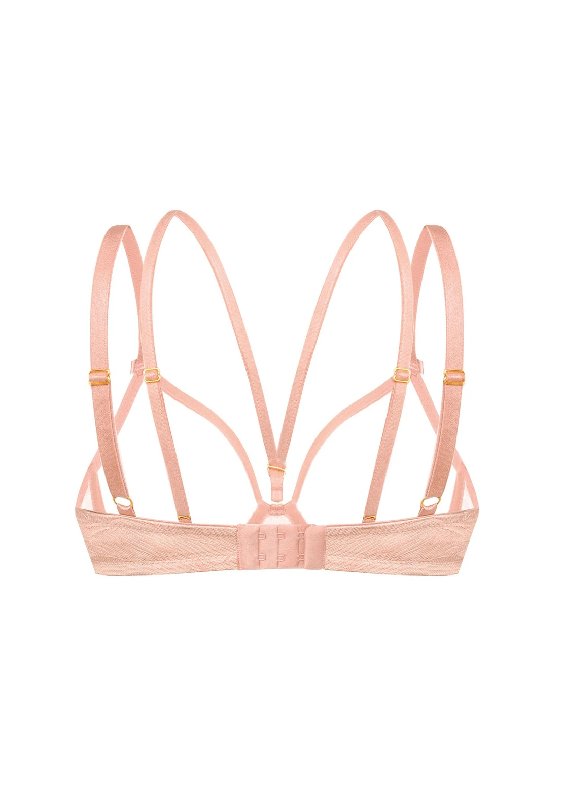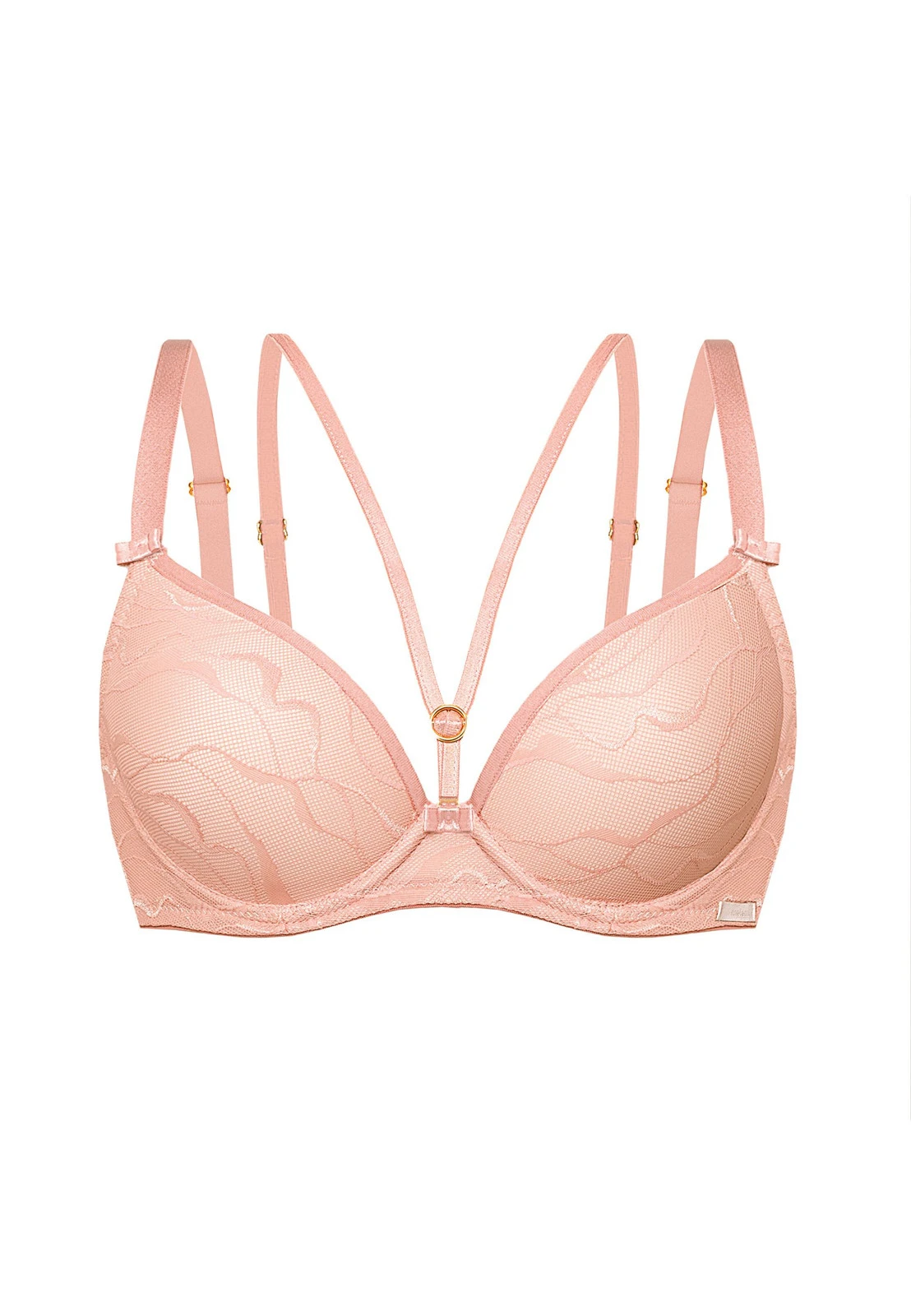 Charakterystycznym elementem modelu są dekoracyjne paseczki przy dekolcie, które dodają mu nowoczesnego i odważnego charakteru. Tył biustonosza również zachwyca – regulowane paseczki tworzą efektowną kompozycję, zapewniając jednocześnie stabilne podtrzymanie biustu. Regulowane ramiączka oraz trzystopniowe zapięcie na haftki pozwalają na idealne dopasowanie biustonosza do sylwetki.