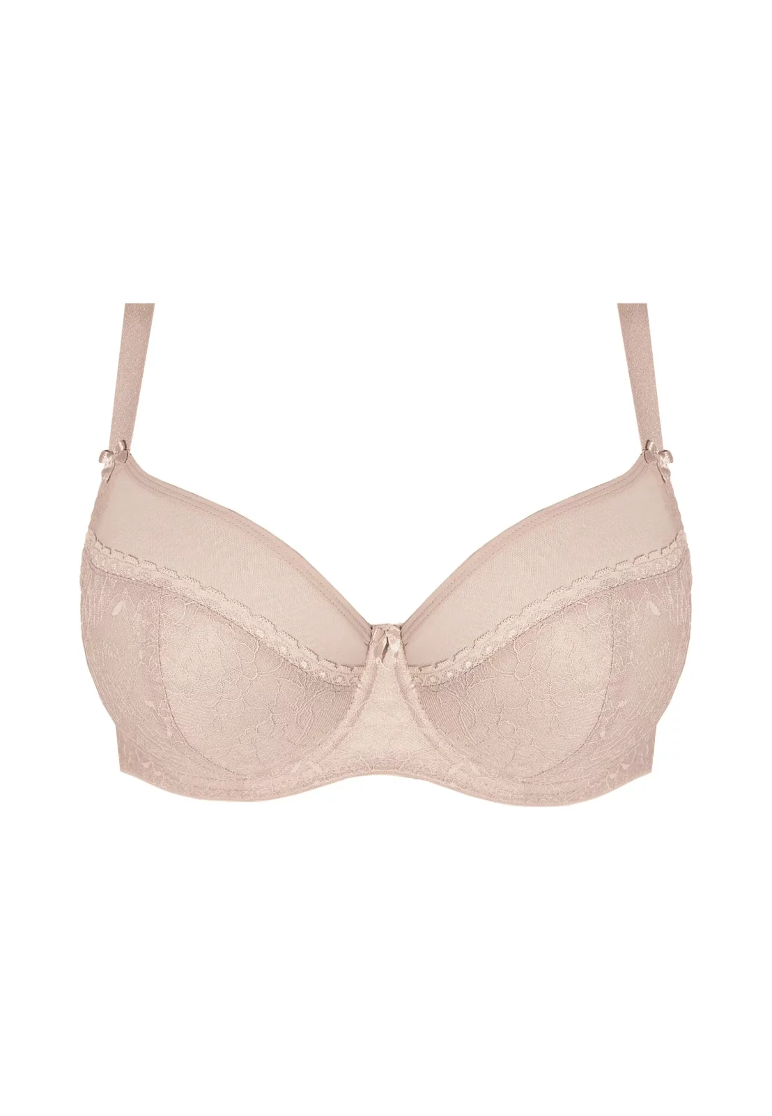 Miseczki biustonosza wykonane z delikatnej koronki subtelnie zdobią biust, jednocześnie zapewniając doskonałe podtrzymanie i modelowanie, mimo swojej miękkiej konstrukcji. Precyzyjny krój idealnie formuje piersi, nadając im naturalny i harmonijny kształt. Lekko prześwitujący materiał nadaje całości zmysłowego charakteru, a wykończenie z kontrastowymi detalami podkreśla unikalny design.