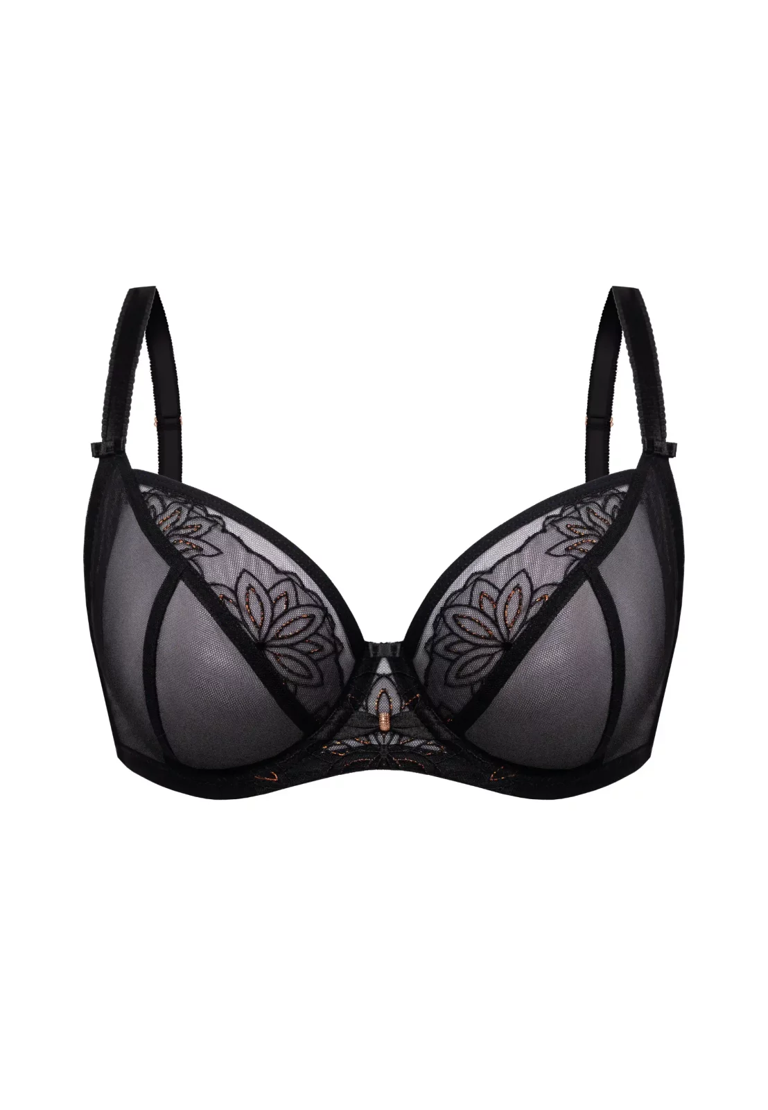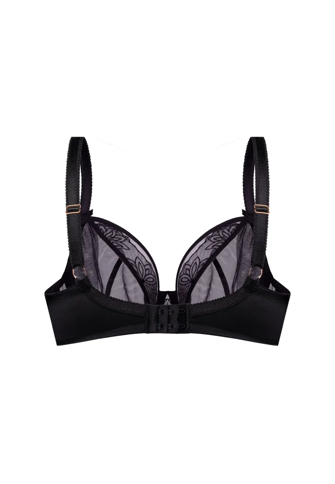 Wykonany z delikatnego, półprzezroczystego tiulu zdobionego kwiatowym haftem, zapewnia zmysłowy wygląd i doskonałe dopasowanie. Konstrukcja BO52 z fiszbinami gwarantuje odpowiednie podtrzymanie biustu, a miękkie miseczki modelują naturalny kształt piersi. Ozdobne detale, takie jak subtelne hafty i biżuteryjny element na mostku, dodają całości luksusowego charakteru. Regulowane ramiączka i wygodne zapięcie na haftki pozwalają na indywidualne dopasowanie do sylwetki.