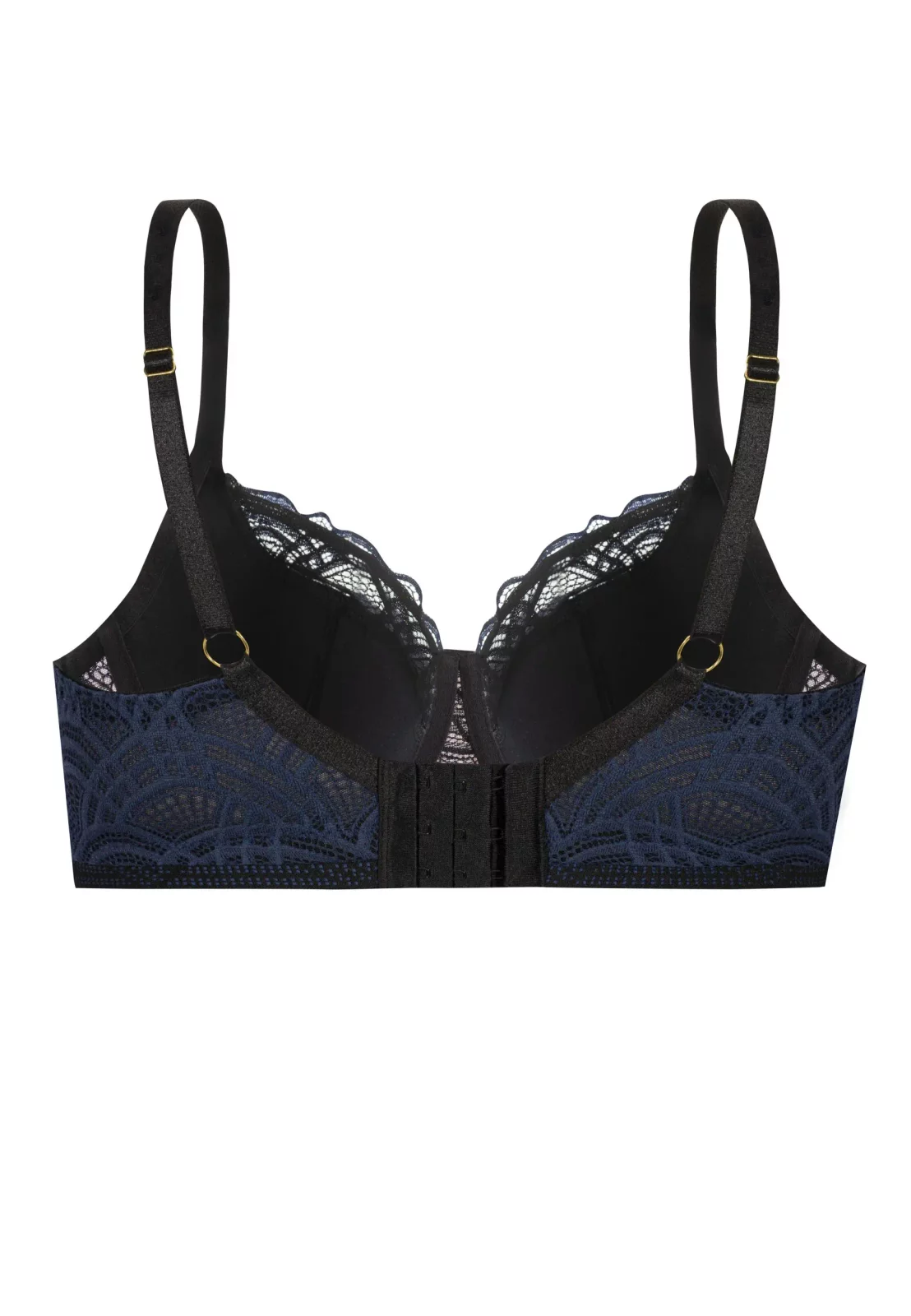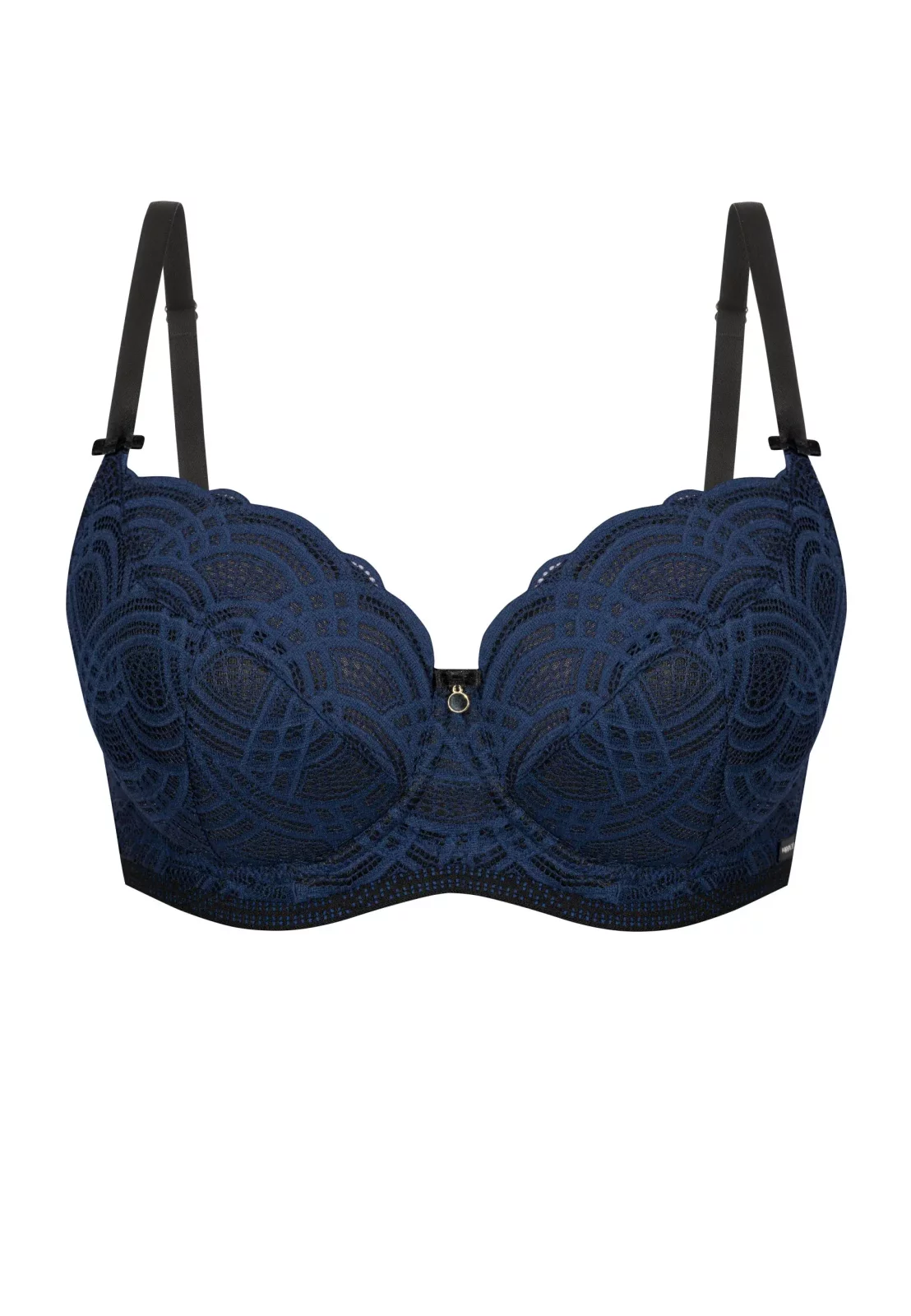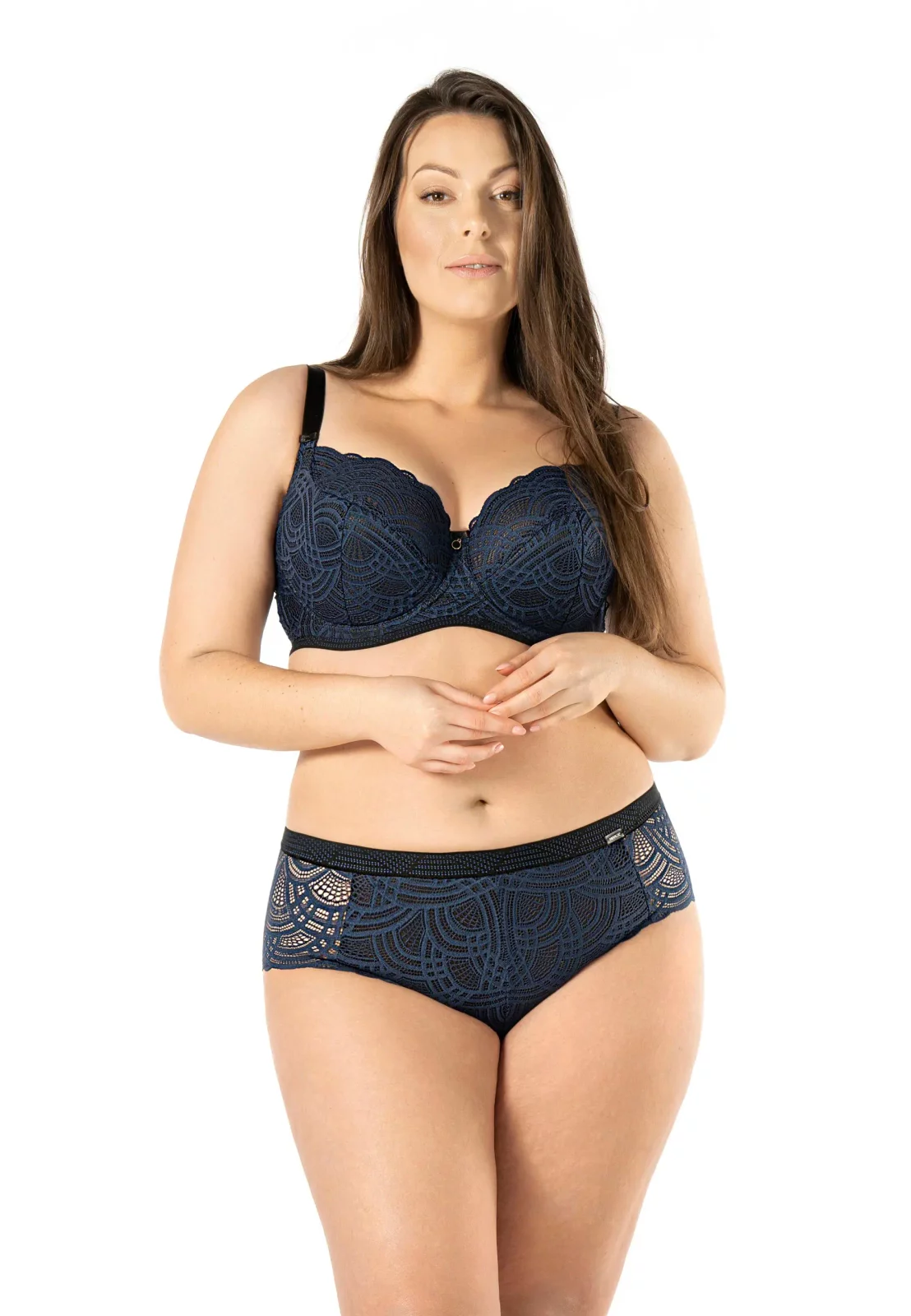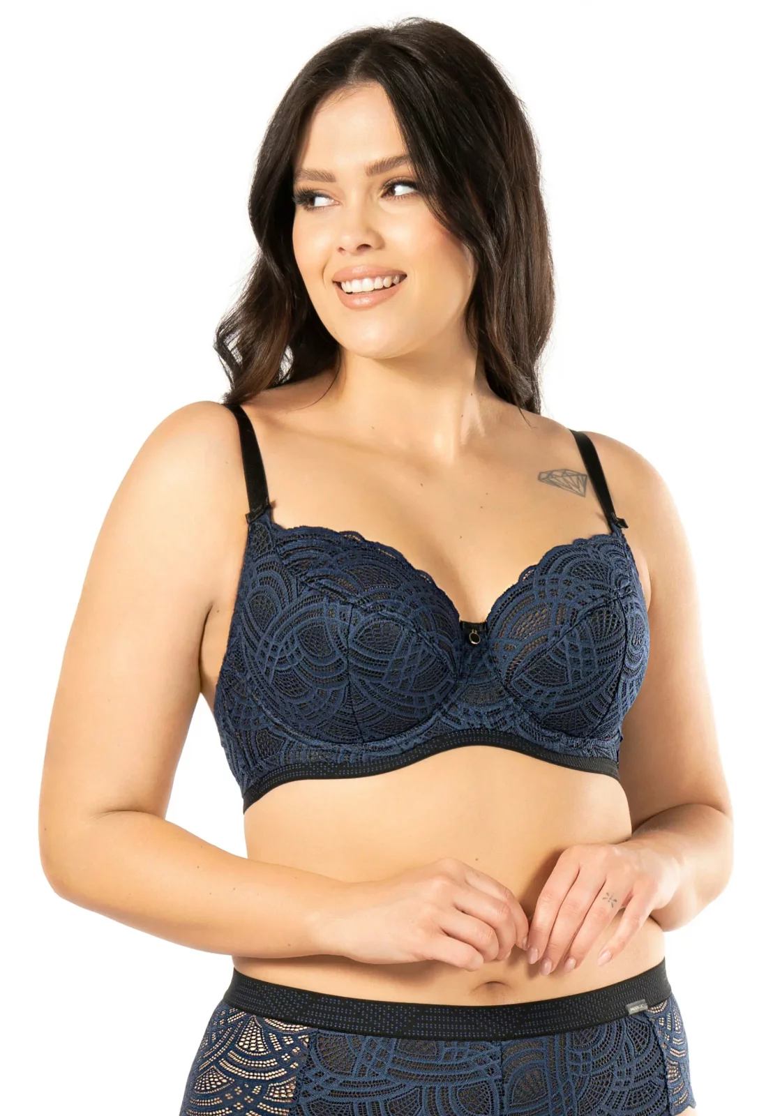 Dzięki półusztywnianej konstrukcji biustonosz zapewnia naturalne podkreślenie kształtu biustu, jednocześnie gwarantując komfort noszenia przez cały dzień. Regulowane ramiączka i zapięcie na plecach pozwalają na indywidualne dopasowanie do sylwetki. Delikatna koronkowa aplikacja w kolorze granatowym dodaje modelowi wyjątkowego uroku, podkreślając kobiecą zmysłowość.