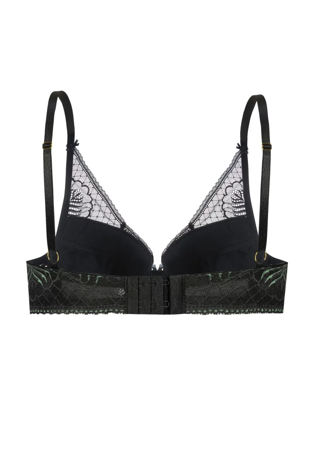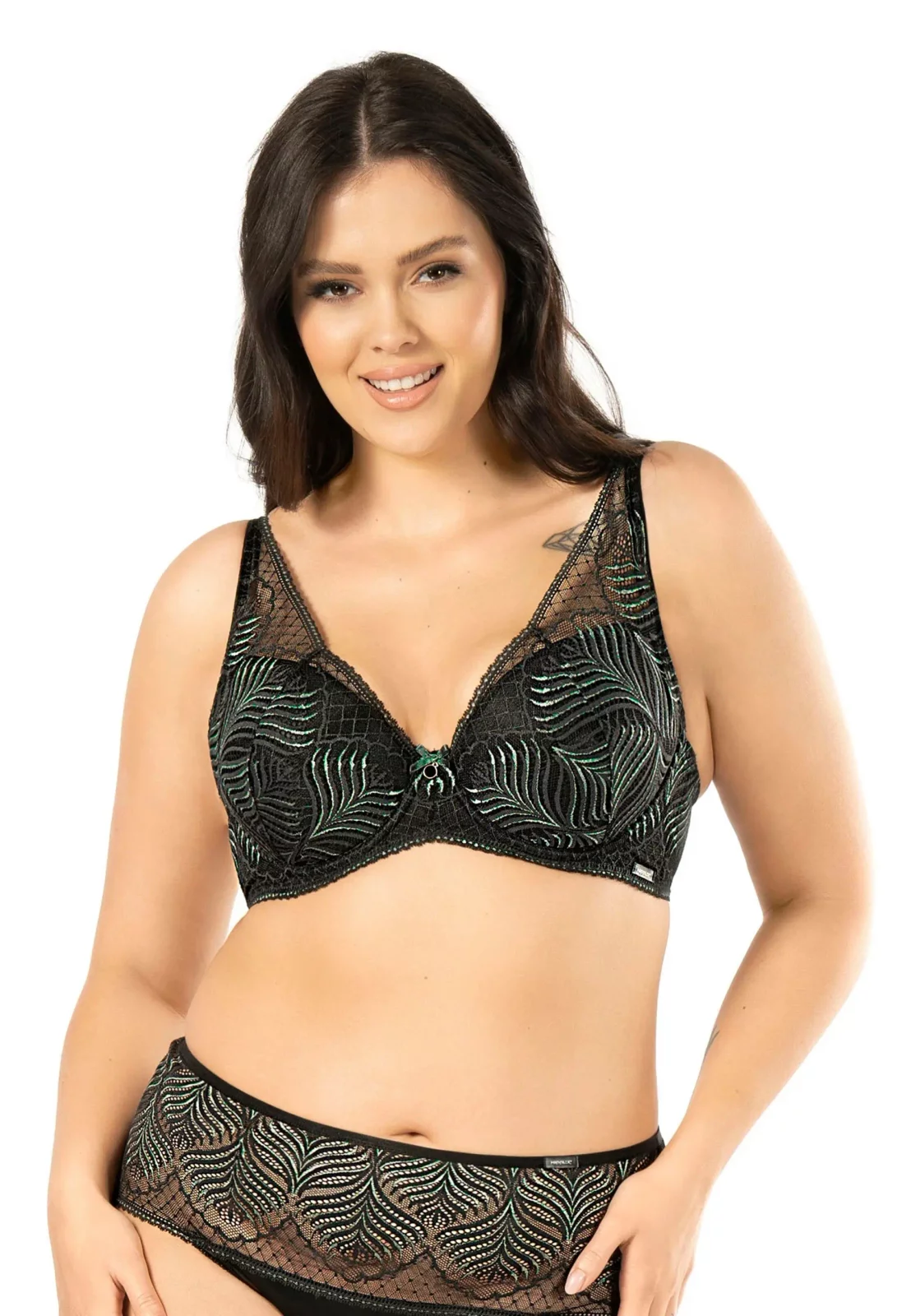 Odkryj niezwykły biustonosz push-up Diana marki Mefemi – kwintesencję elegancji i zmysłowości. Wykonany z delikatnych, koronkowych materiałów, przyciąga uwagę wyjątkowym, zielonym wzorem na czarnym tle. Jego precyzyjne wykończenie i bogaty design podkreślają piękno kobiecej sylwetki, dodając jej wyjątkowego uroku.