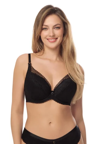 Biustonosz dostępny jest w trzech uniwersalnych kolorach: beżowym, czarnym oraz białym, dzięki czemu idealnie dopasuje się do każdej garderoby. Regulowane ramiączka i solidne zapięcie na haftki z tyłu gwarantują stabilność i wygodę noszenia przez cały dzień. Dodatkowo, subtelne detale w postaci koronkowych wykończeń i ozdobnego elementu pomiędzy miseczkami podkreślają wyrafinowany styl tego modelu.