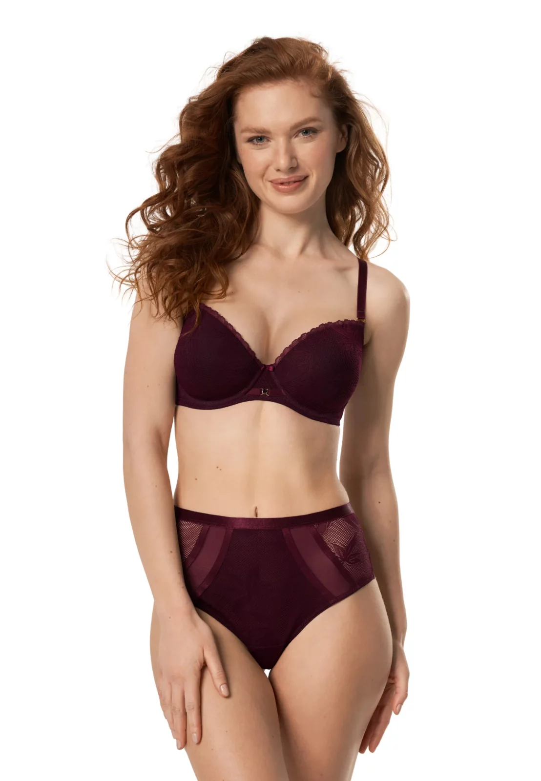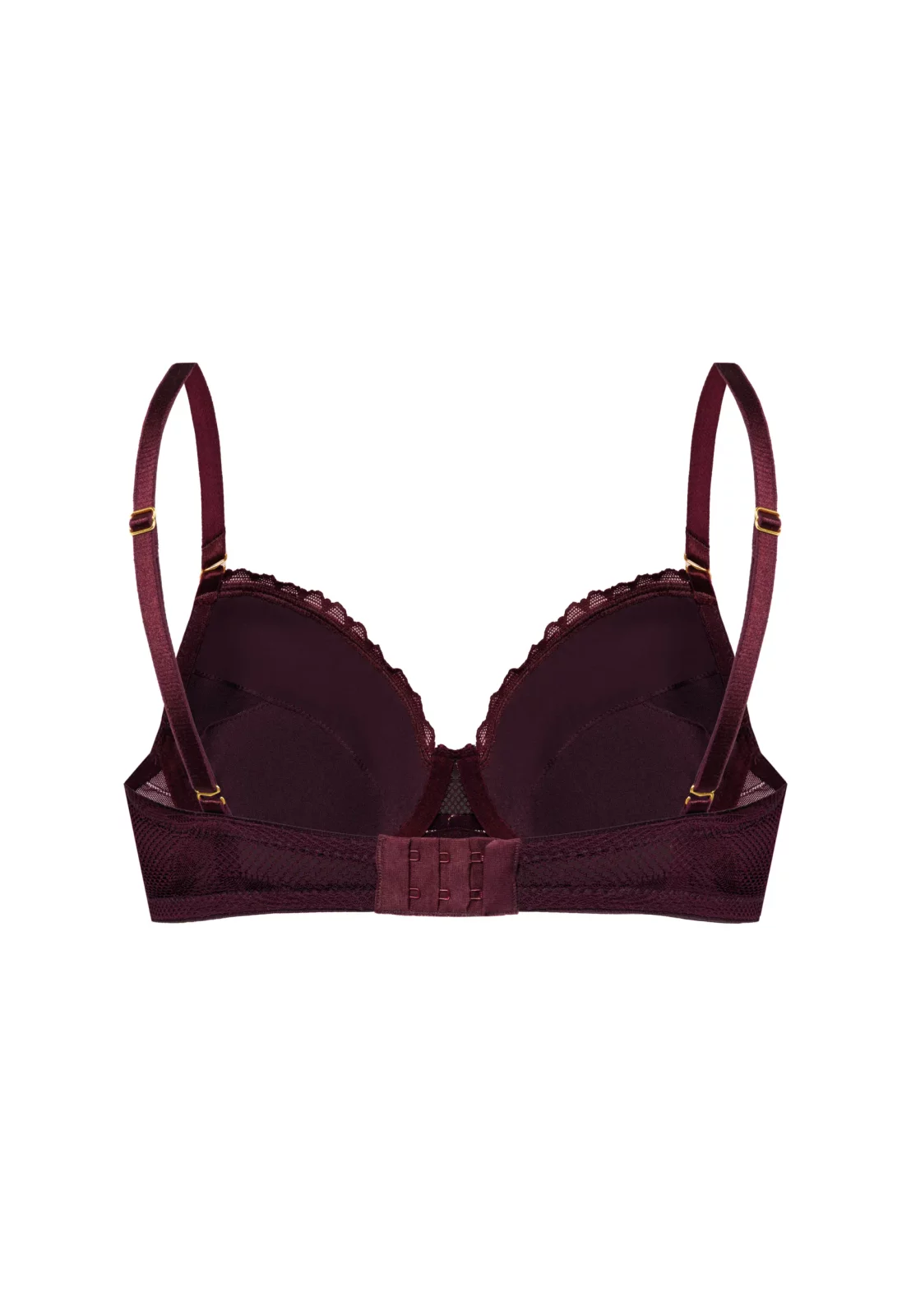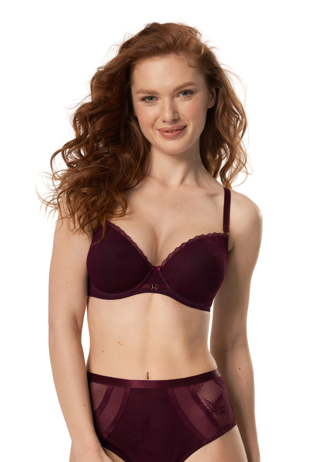 Kolor burgundowy nadaje całości zmysłowego i eleganckiego charakteru, a delikatny wzór na tkaninie sprawia, że biustonosz jest nie tylko funkcjonalny, ale również niezwykle stylowy. To propozycja dla kobiet, które chcą uzyskać spektakularny efekt powiększenia biustu, zachowując komfort noszenia.