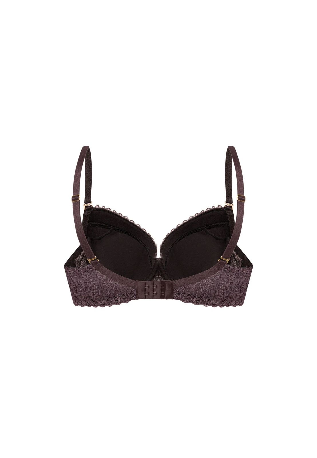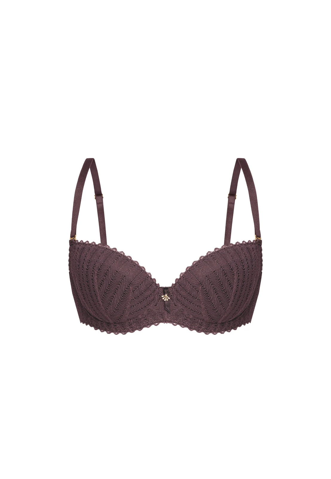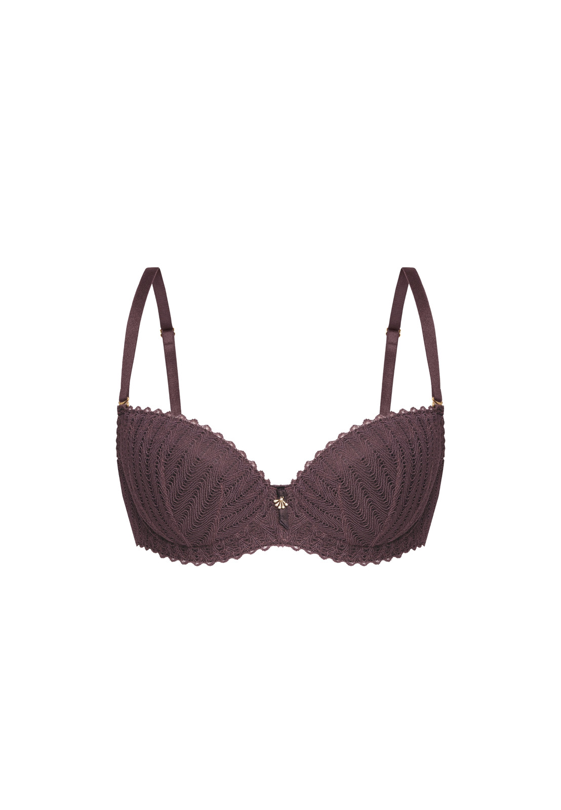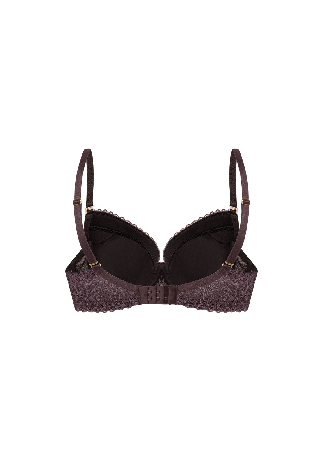 Biustonosz Veronica Push-Up to model stworzony z myślą o kobietach, które pragną połączyć zmysłowy wygląd z wyjątkowym komfortem. Wykonany z finezyjnej koronki o falistym wzorze w głębokim, śliwkowym odcieniu, zachwyca elegancją i subtelnym połyskiem. Jego dopracowana konstrukcja z efektem push-up delikatnie unosi, zbiera i optycznie powiększa biust, nadając mu pełniejszy i bardziej zaokrąglony kształt.