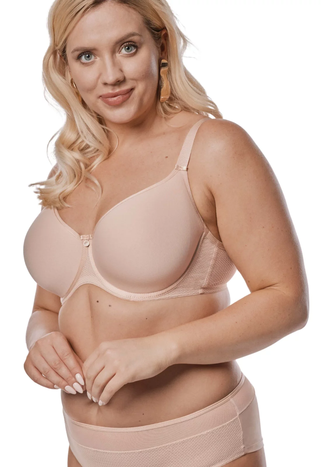 Ten gładki biustonosz o konstrukcji minimizer został zaprojektowany tak, aby optycznie zmniejszać biust, zapewniając jednocześnie doskonałe podtrzymanie i wygodę. Dzięki specjalnie profilowanym miseczkom oraz szerokim, regulowanym ramiączkom, biustonosz perfekcyjnie dopasowuje się do ciała, nie powodując ucisku. Model wykonano z delikatnego materiału, który jest przyjazny dla skóry i zapewnia maksymalny komfort noszenia przez cały dzień. Uniwersalny cielisty odcień sprawia, że biustonosz Celine doskonale nadaje się do noszenia pod różnego rodzaju ubraniami, w tym pod jasnymi i dopasowanymi stylizacjami.