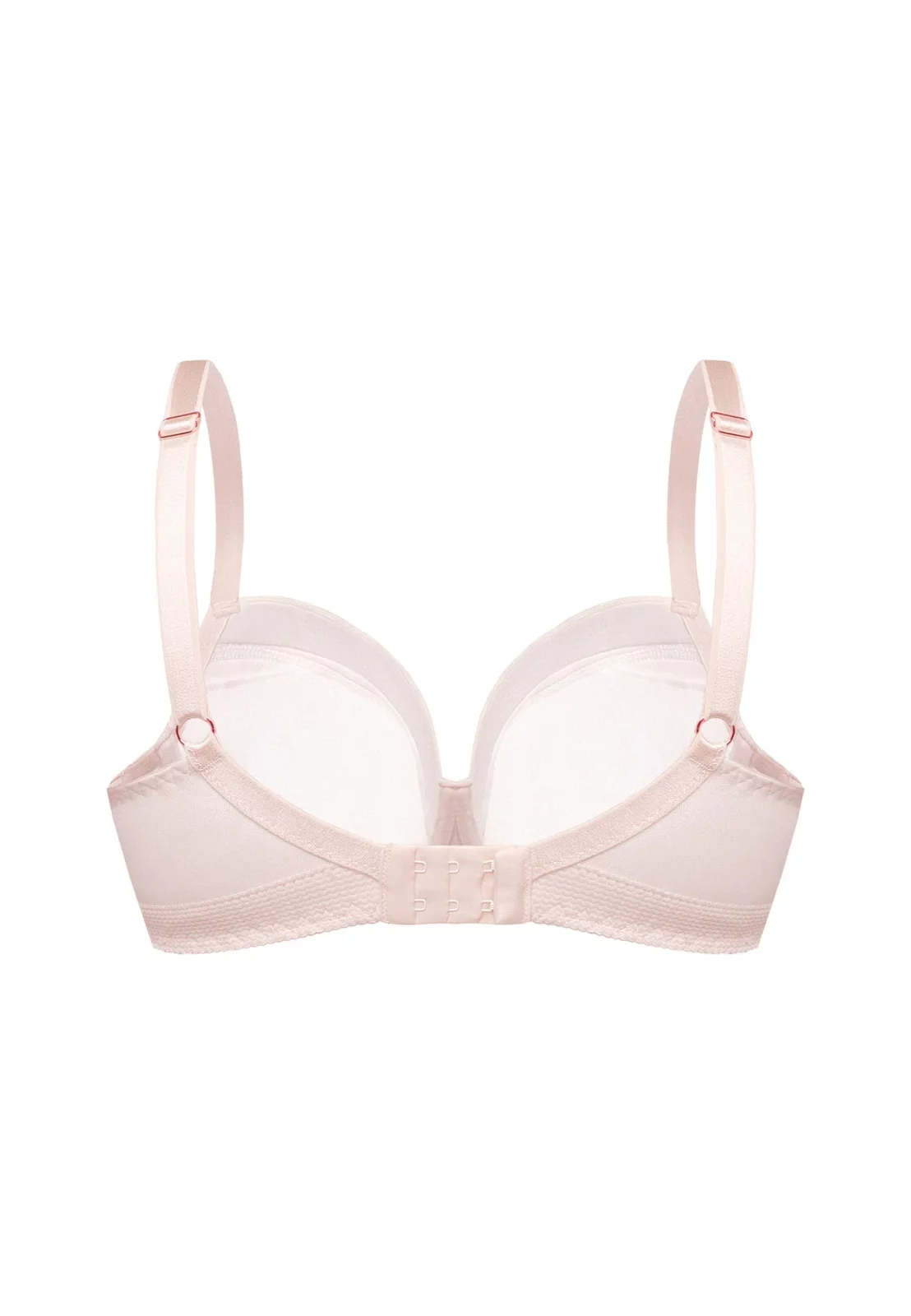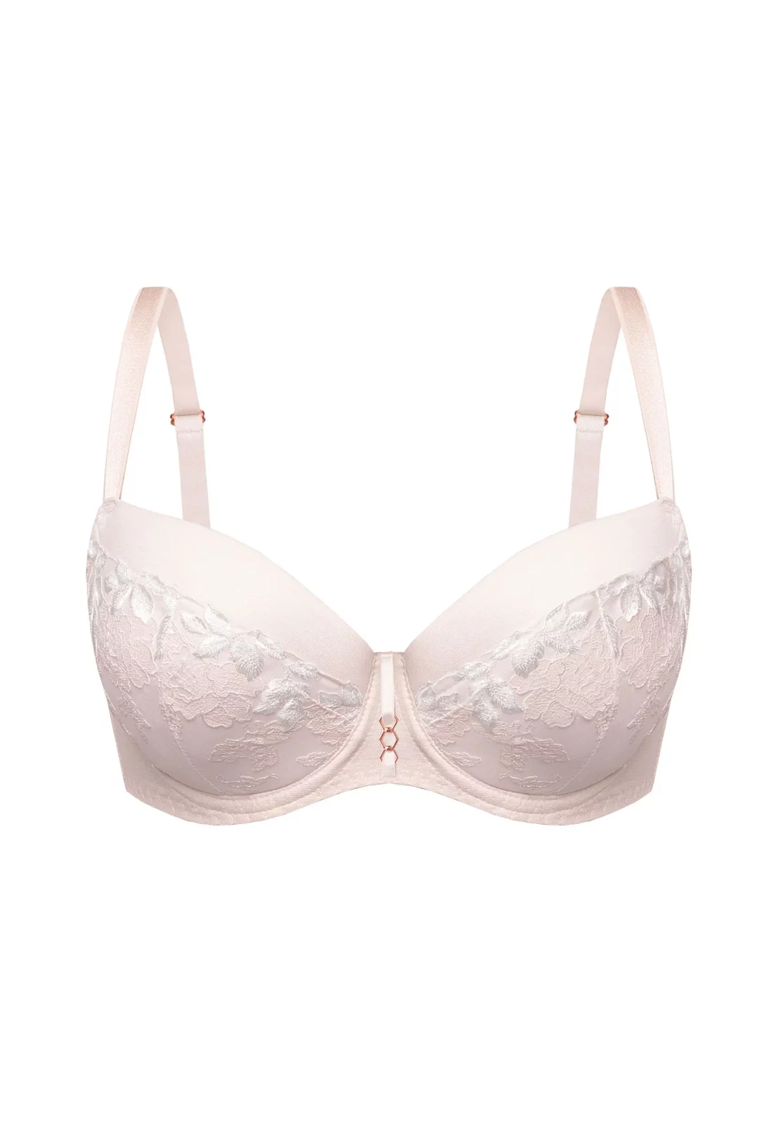 Biustonosz posiada wbudowane fiszbiny i formowane termicznie miseczki, które gwarantują stabilne podtrzymanie nawet przy większych rozmiarach. Elegancka ozdoba w kolorze różowego złota w centralnej części dodaje wyjątkowego uroku. Model Albina wyposażono również w regulowane ramiączka i trzystopniowe zapięcie z tyłu, co umożliwia idealne dopasowanie do sylwetki.