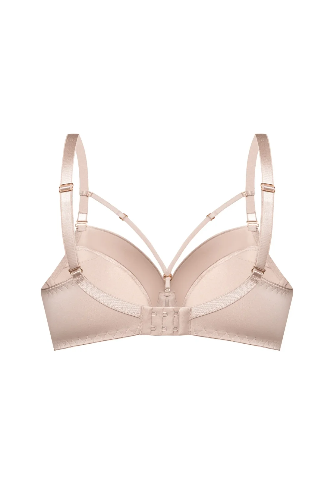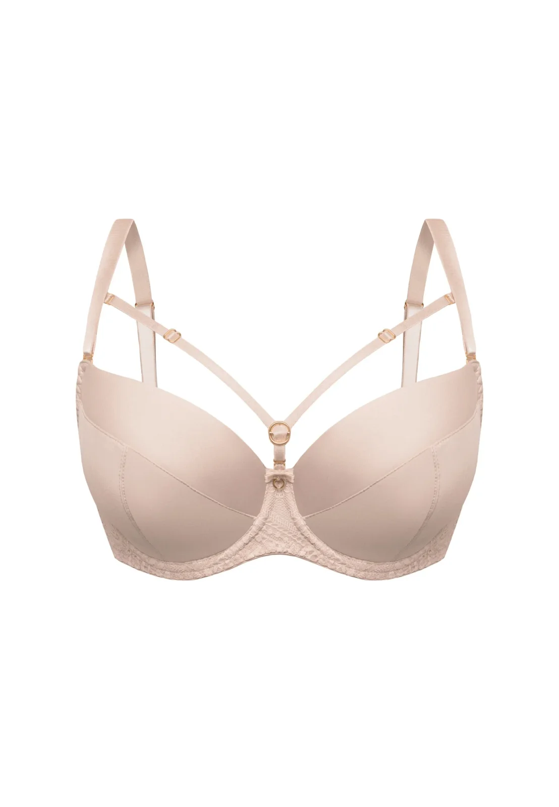 Wykonany z wysokiej jakości materiałów, zapewnia doskonałe podtrzymanie i wygodę noszenia przez cały dzień. Kluczowym elementem wyróżniającym ten model są ozdobne paski z przodu, które dodają mu wyjątkowego charakteru i podkreślają dekolt w efektowny sposób. Regulowane ramiączka oraz tylne zapięcie na haftki pozwalają na idealne dopasowanie do sylwetki, gwarantując maksymalny komfort. Biustonosz Desire dostępny jest w uniwersalnym, cielistym odcieniu, który doskonale sprawdzi się pod każdą stylizacją. Detale w postaci złotych akcentów na zapięciach pasków nadają całości luksusowego wyglądu.