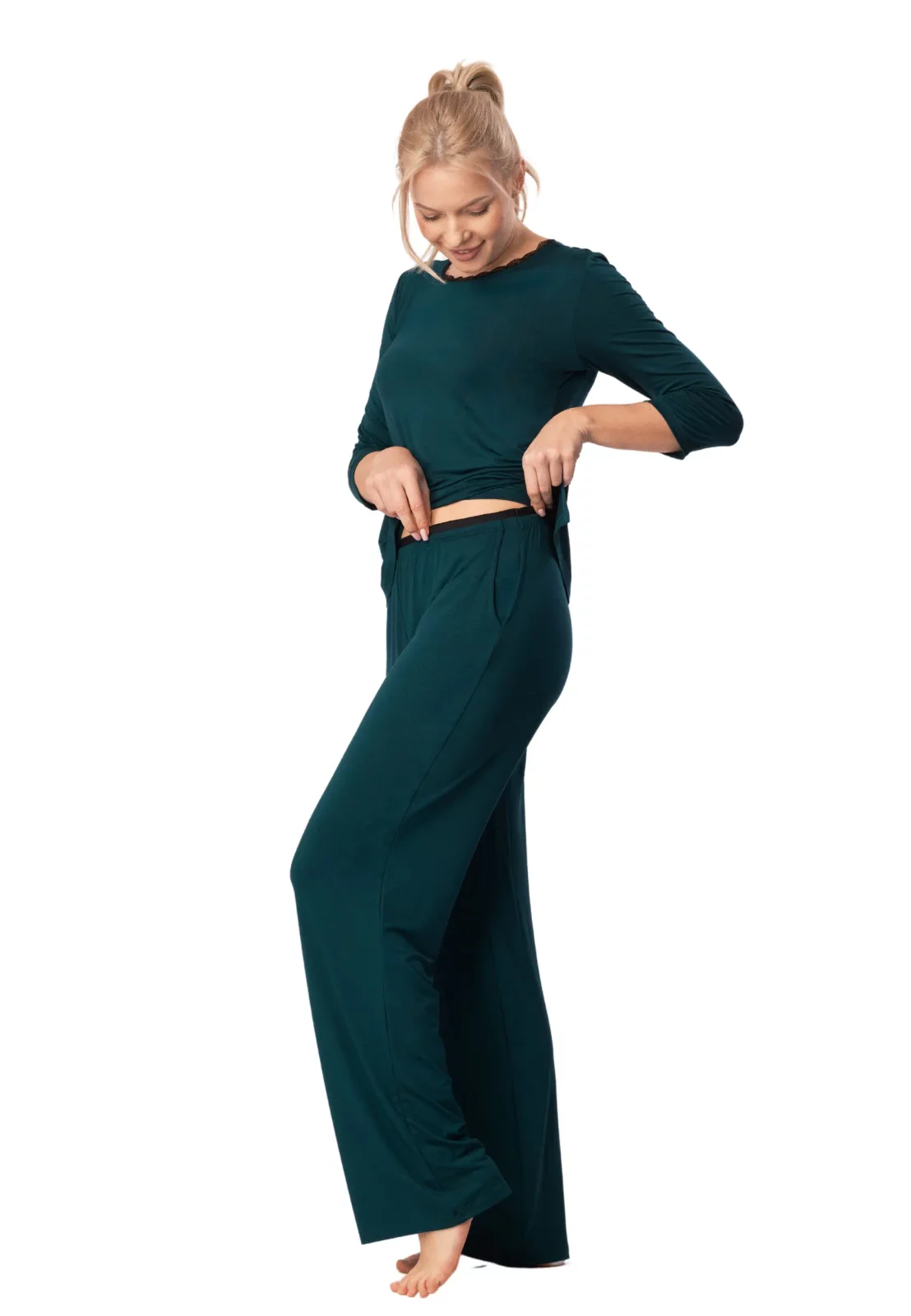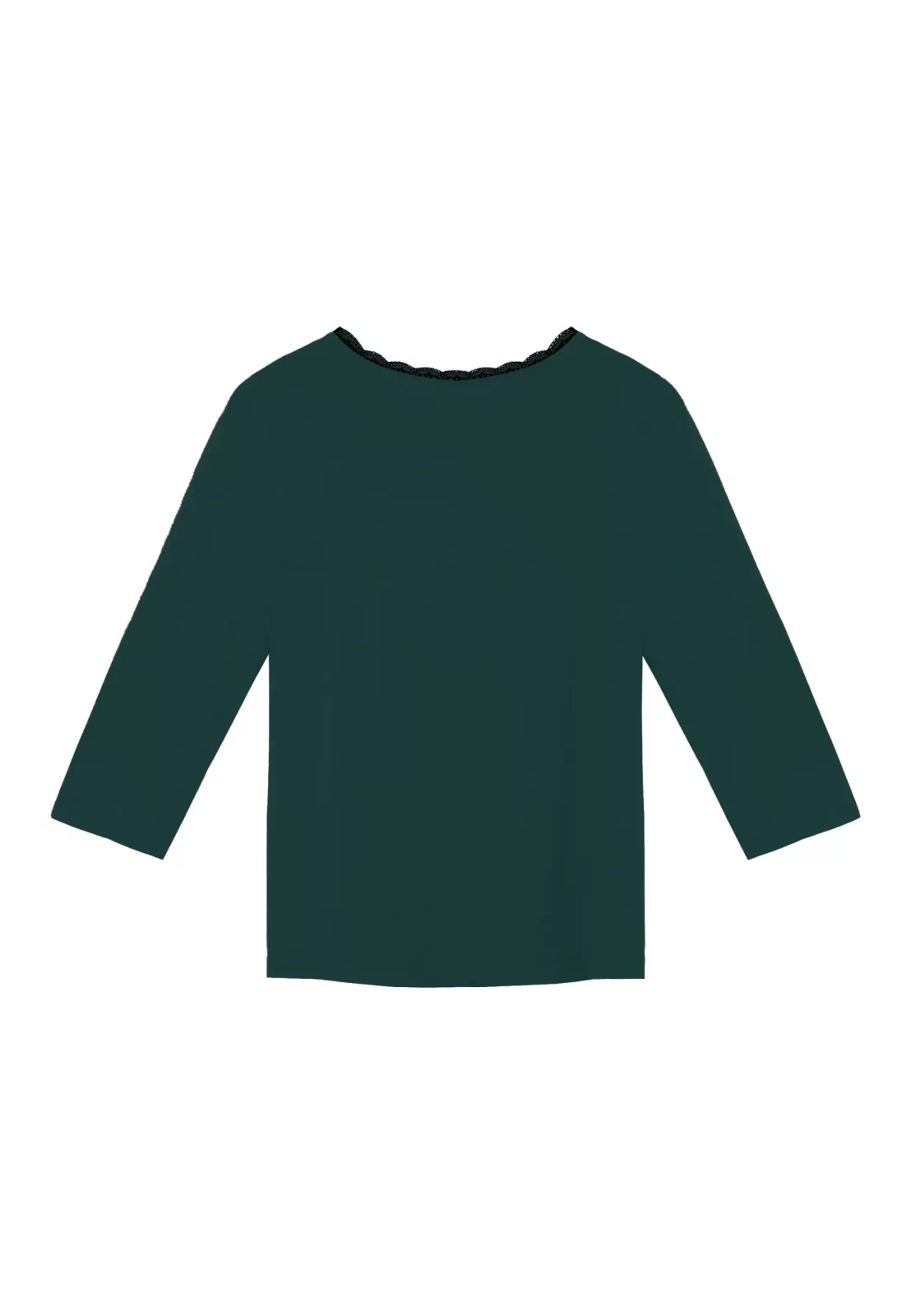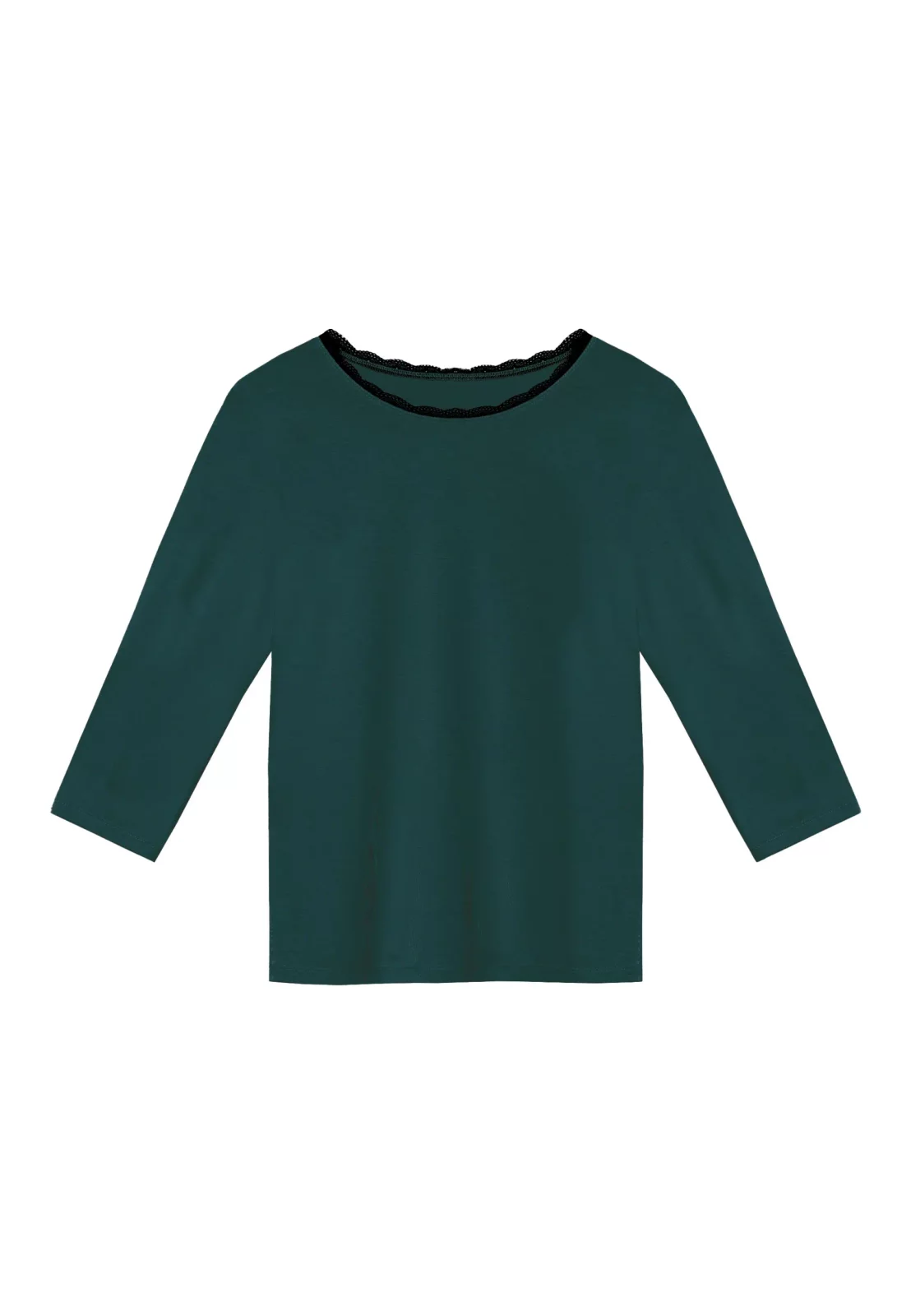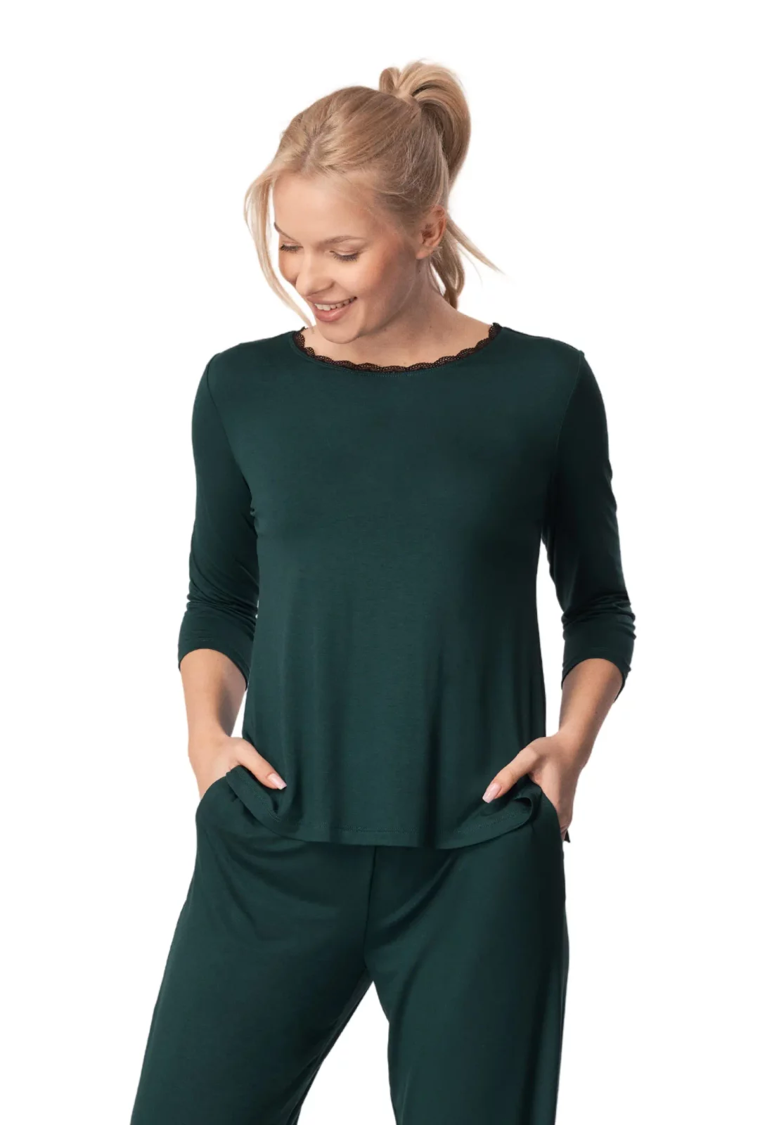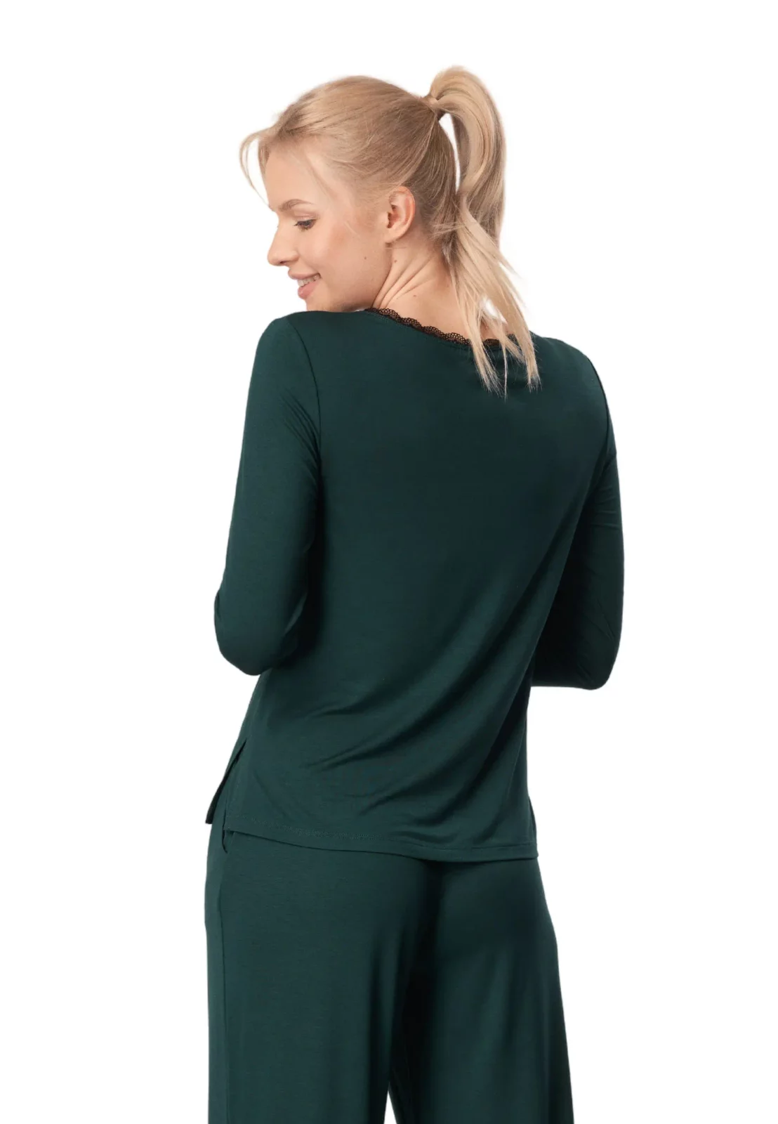 Wykonana z wysokogatunkowej wiskozy, zapewnia wyjątkową miękkość i przewiewność, co sprawia, że jest idealna do noszenia przez cały rok. Długie rękawy o klasycznym kroju oraz dekolt wykończony subtelną koronką dodają całości delikatnego uroku i kobiecego charakteru. Ciemnozielony odcień bluzki jest ponadczasowy, elegancki i pasuje do każdego stylu. Dzięki elastycznemu materiałowi bluzka idealnie dopasowuje się do sylwetki, nie krępując ruchów, co dodatkowo podnosi komfort użytkowania.