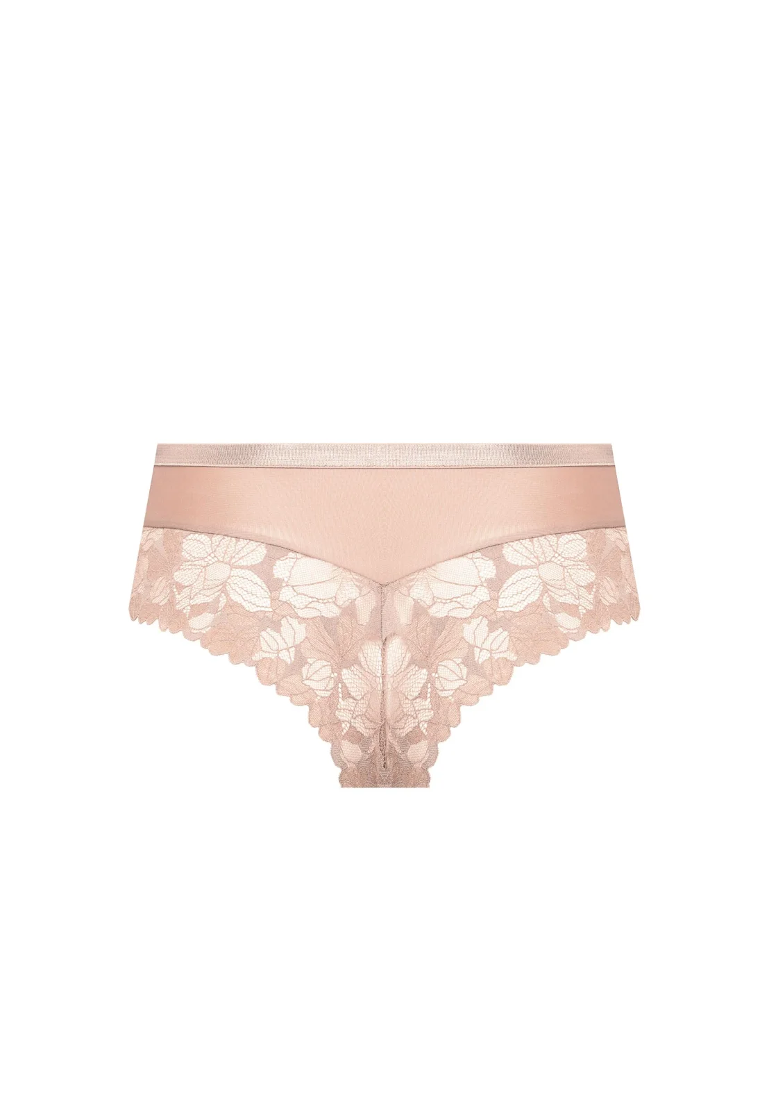 Koronkowy tył pięknie podkreśla kształty, a brazylijski krój optycznie wydłuża nogi i nadaje pośladkom naturalnie zaokrąglony kształt. Gładki przód sprawia, że majtki dobrze układają się pod ubraniem, zapewniając komfort przez cały dzień.