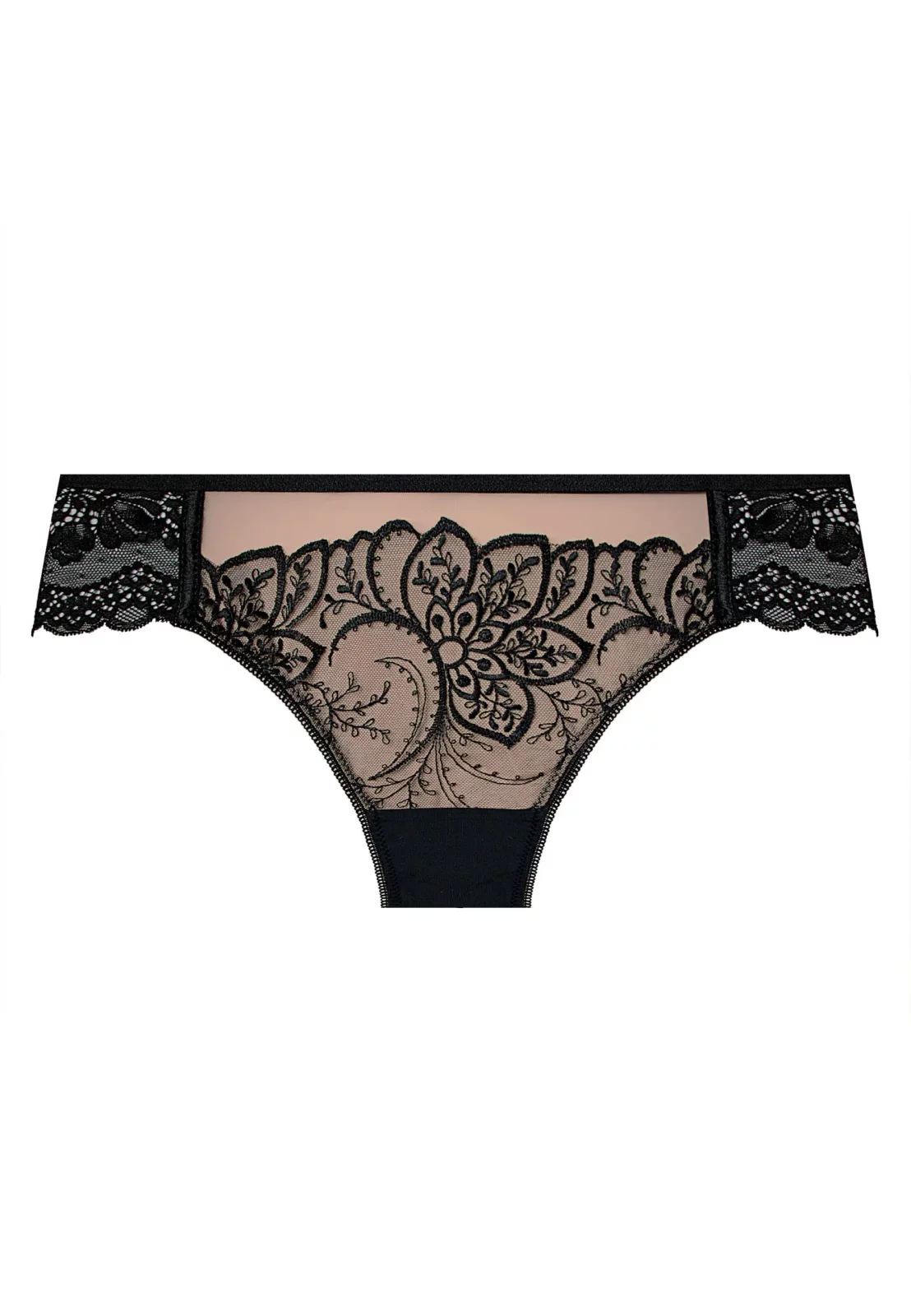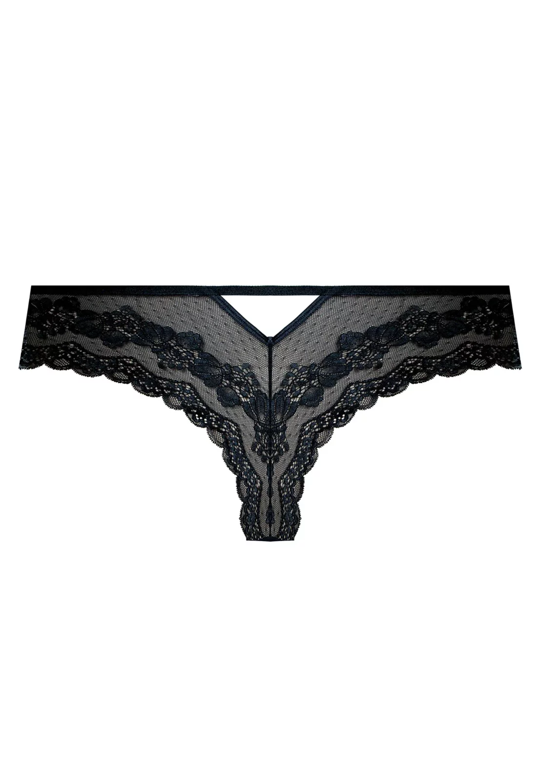 Brazyliany Livia marki Mefemi w klasycznym czarnym kolorze to bielizna stworzona z myślą o kobietach, które cenią elegancję i zmysłowy styl. Wykonane z delikatnej koronki o kwiatowym wzorze, doskonale podkreślają kobiece kształty. Przód bielizny zdobi subtelny haft na transparentnym materiale, co nadaje całości wyjątkowego charakteru.