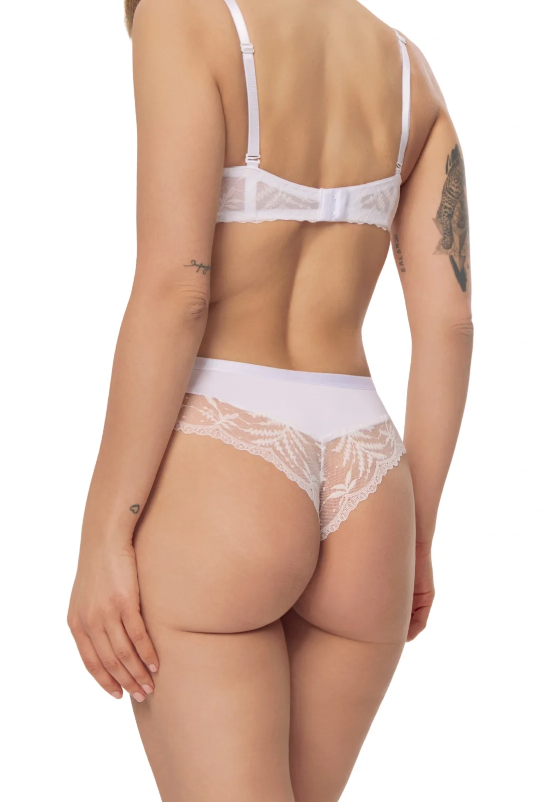 Przód brazylian wykonany jest z gładkiego, elastycznego materiału, który wygładza linię brzucha i zapewnia komfort noszenia. Tył oraz boki zdobi subtelna, koronka o roślinnym wzorze, nadająca bieliźnie lekkości i kobiecego charakteru. Elastyczna talia dopasowuje się do sylwetki, nie uciska i nie odznacza się pod ubraniem, dzięki czemu brazyliany Petra sprawdzą się zarówno pod dopasowanymi stylizacjami, jak i na specjalne okazje.