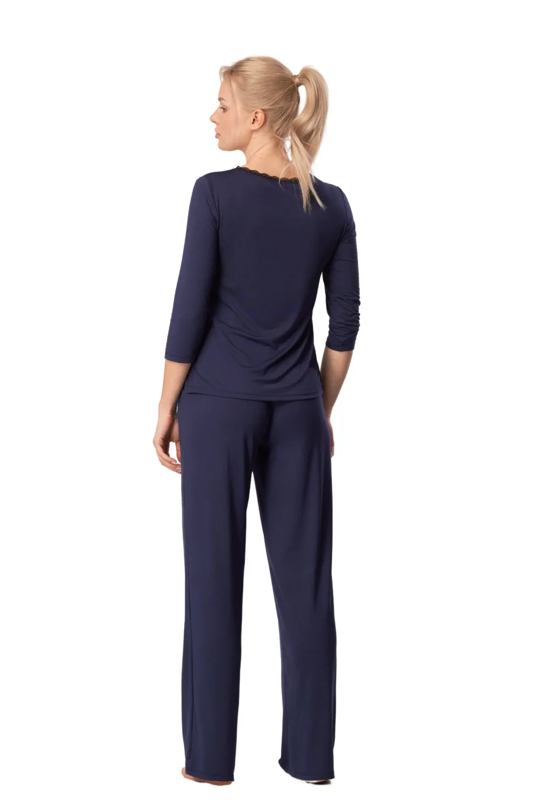 Wykonane z wysokiej jakości wiskozy, charakteryzują się miękkością, delikatnością oraz doskonałym dopasowaniem do sylwetki. Wiskoza to materiał oddychający, który zapewnia uczucie świeżości oraz doskonałą cyrkulację powietrza, dzięki czemu te spodnie idealnie sprawdzą się zarówno w chłodniejsze, jak i cieplejsze noce. Klasyczny krój z prostymi nogawkami dodaje subtelnego szyku, a elastyczna talia gwarantuje wygodę noszenia przez całą noc. Granatowy kolor spodni sprawia, że wyglądają elegancko i stylowo, stanowiąc idealny wybór dla osób ceniących połączenie estetyki i funkcjonalności.