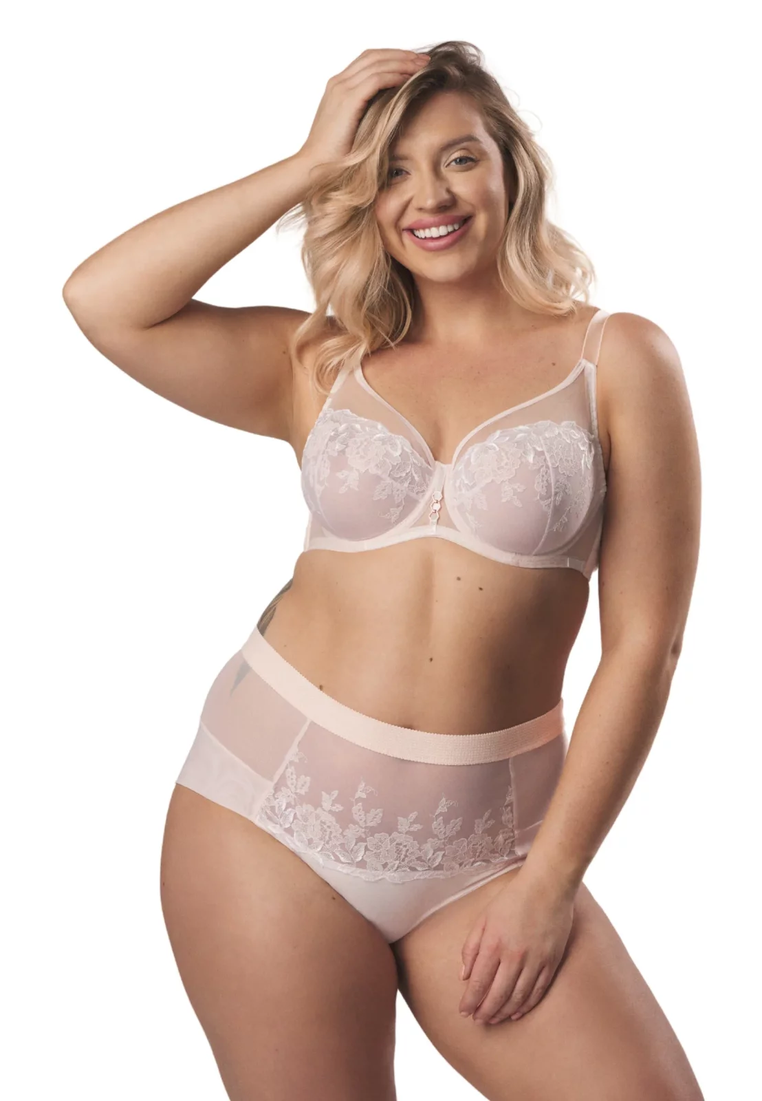 Figi wysokie Albina to kwintesencja wygody i subtelnej elegancji. Wykonane z delikatnego tiulu i zdobione efektownym haftem kwiatowym, doskonale łączą nowoczesny styl z kobiecą klasyką. Wysoki stan idealnie modeluje sylwetkę i podkreśla talię, zapewniając jednocześnie komfort noszenia przez cały dzień. Przód zdobi subtelny haft w odcieniu złamanej bieli i srebra, który dodaje bieliźnie wyjątkowego charakteru.