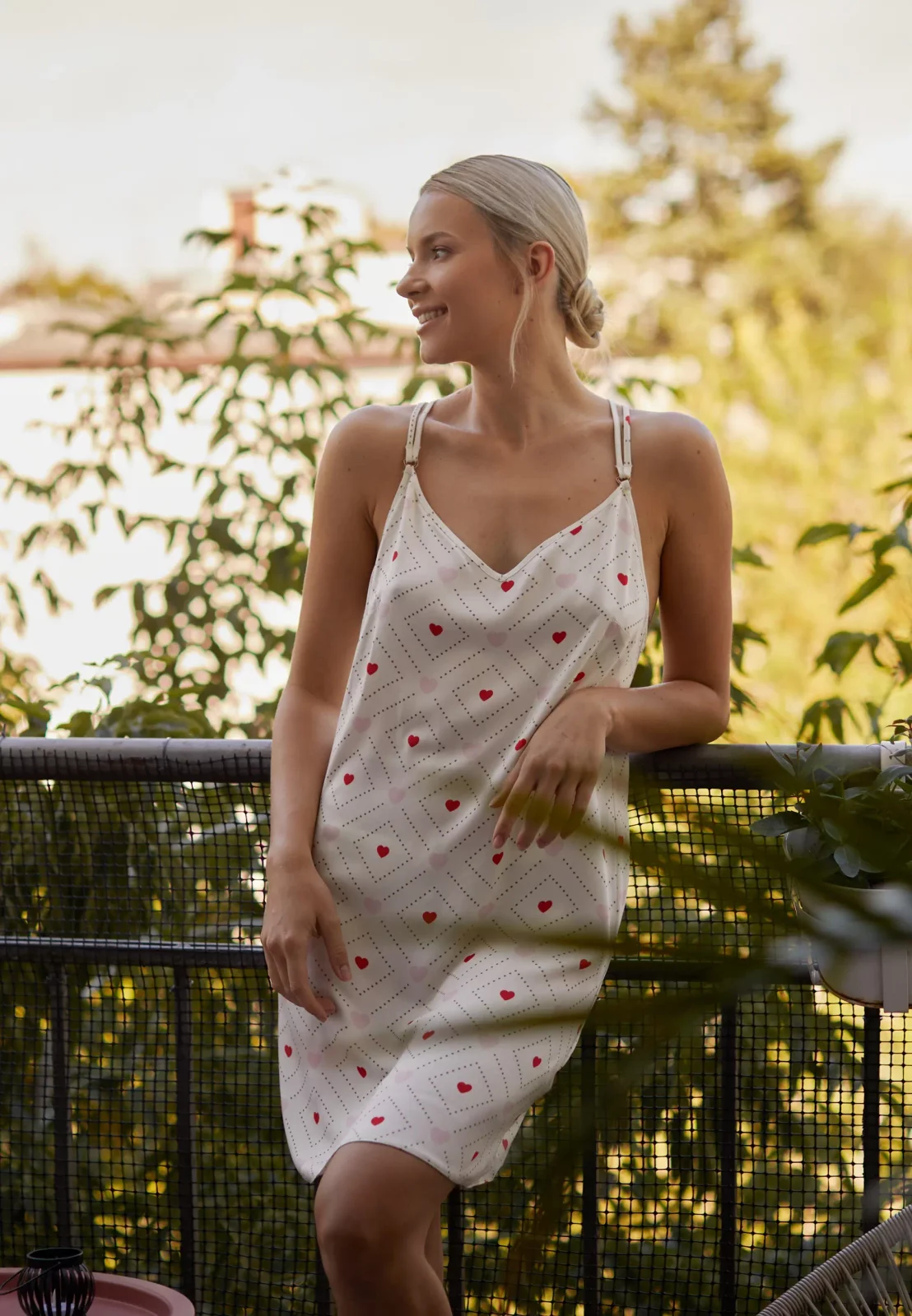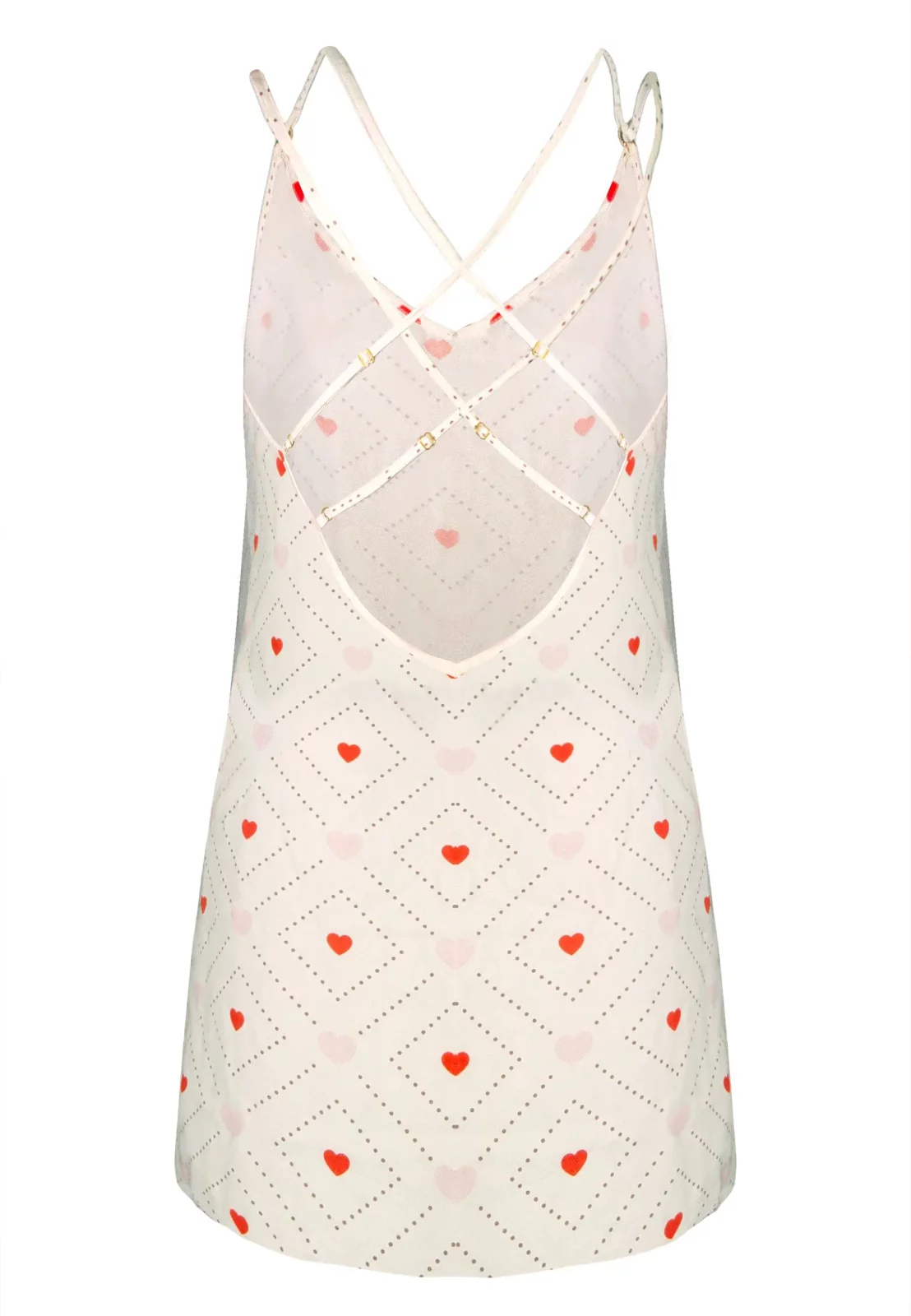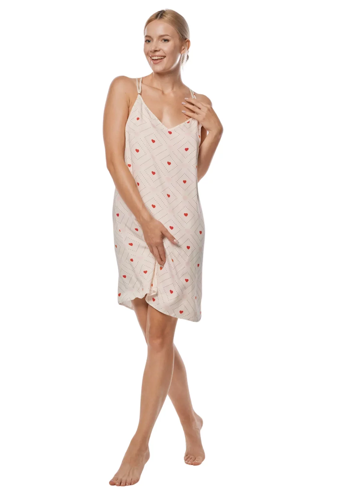 Koszulka JULIANA to idealny wybór dla kobiet, które cenią sobie komfort i elegancję. Wykonana z lekkiej i przewiewnej wiskozy, doskonale układa się na sylwetce, zapewniając przyjemność noszenia przez całą noc. Podwójne regulowane ramiączka pozwalają na dopasowanie do indywidualnych potrzeb, a piękny dekolt w szpic na plecach dodaje zmysłowości. Całość zdobi uroczy wzór czerwonych serduszek, który wprowadza romantyczny akcent do każdej sypialni. Ta koszula nocna łączy w sobie styl i wygodę, czyniąc każdą noc wyjątkową.