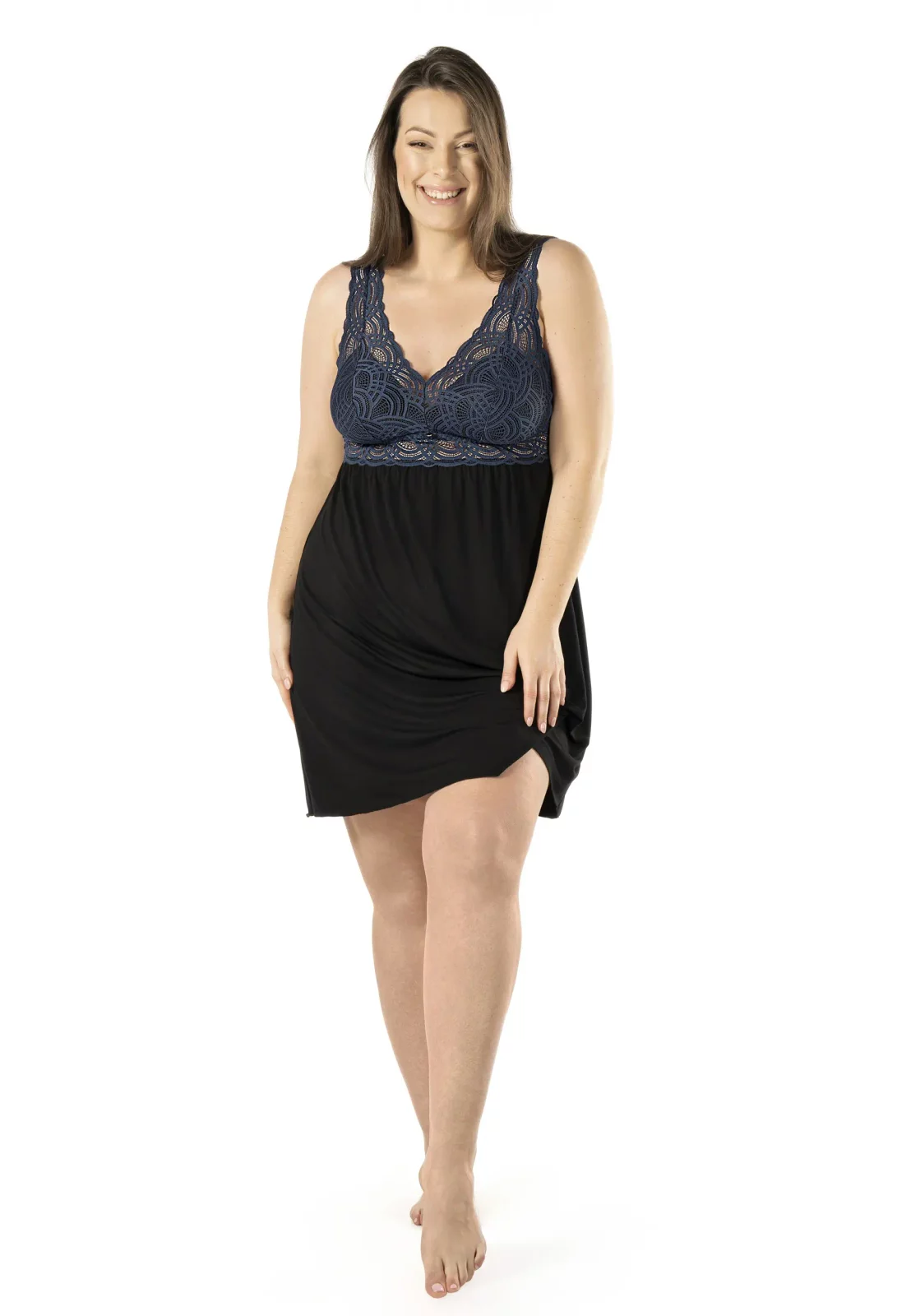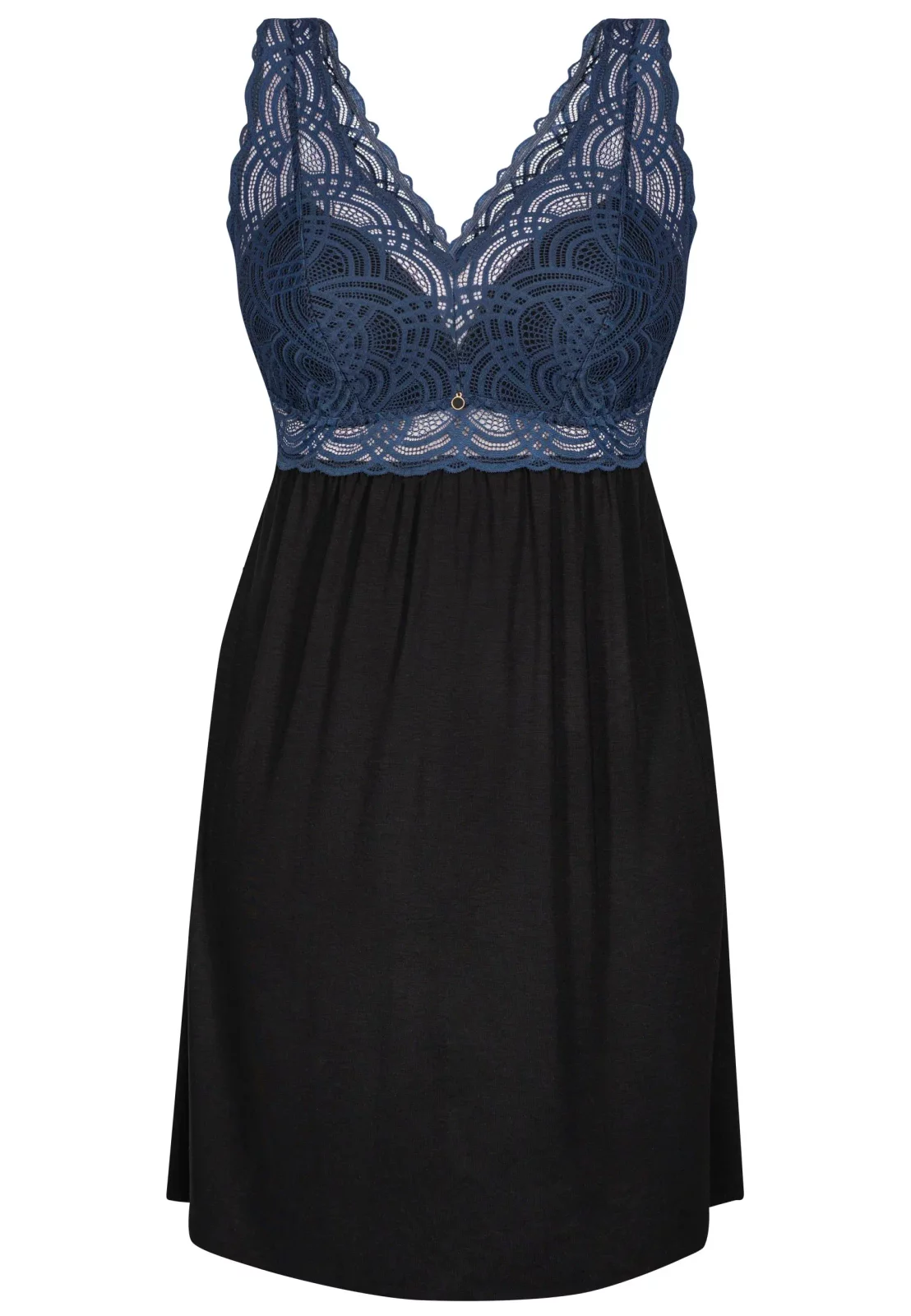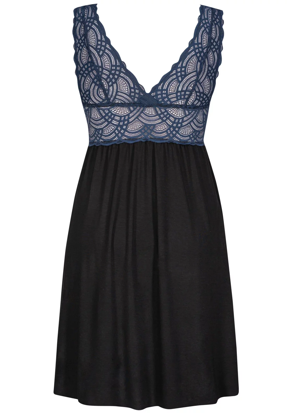 Dolna część koszulki została zaprojektowana z myślą o lekkości i przewiewności. Subtelny krój w kształcie litery A nadaje jej eleganckiego wyglądu, jednocześnie pozwalając skórze oddychać. Koszulka Debora to doskonały wybór na romantyczne wieczory oraz chwile relaksu, dostępna w eleganckim czarnym kolorze z pięknymi granatowymi akcentami.