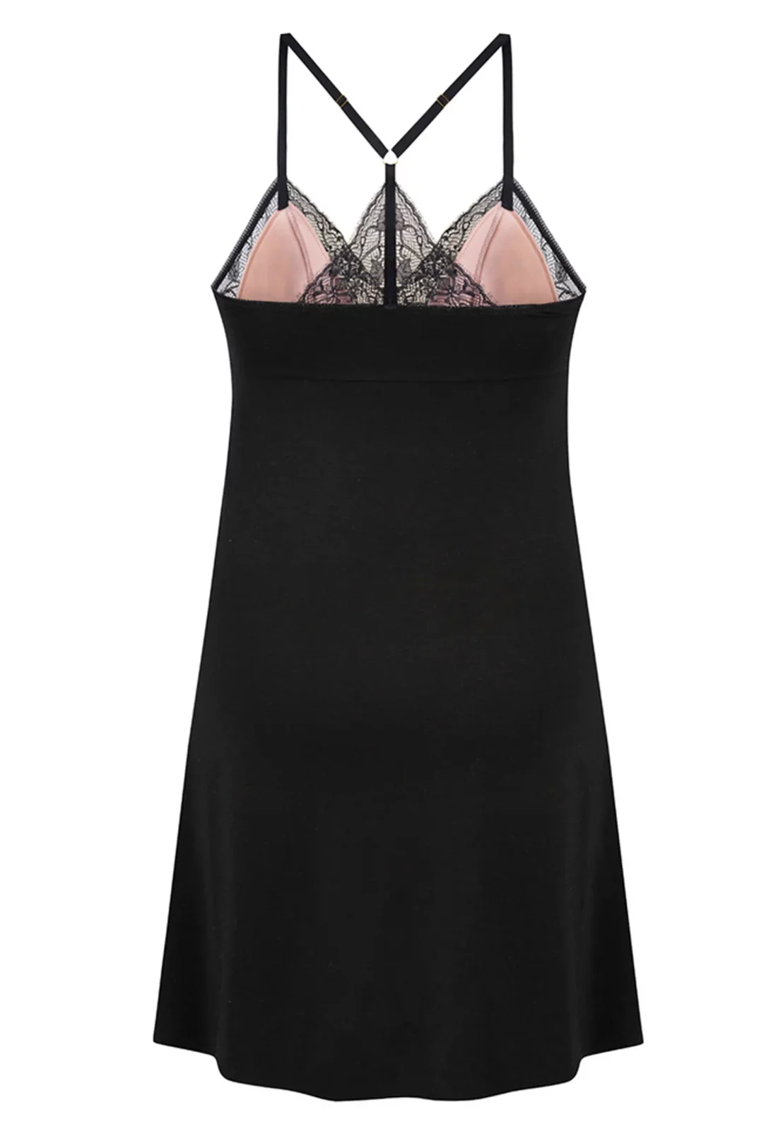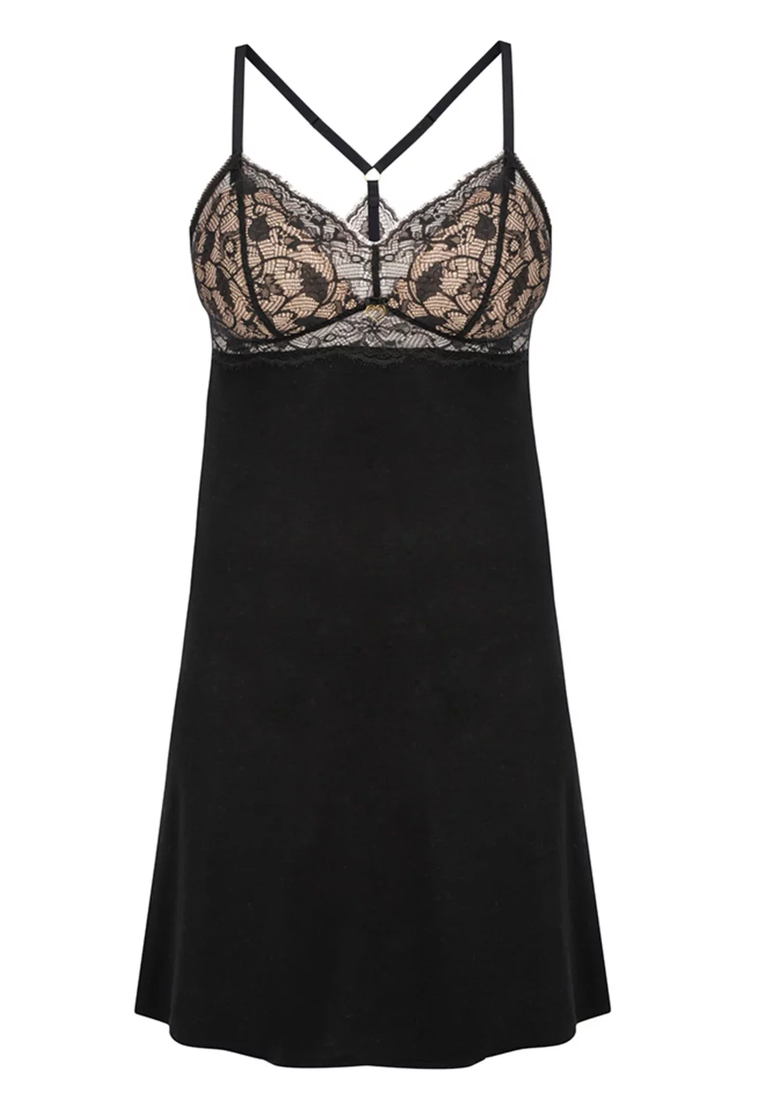 Przód koszulki zdobią usztywniane miseczki, które zapewniają doskonałe podtrzymanie i podkreślają naturalny kształt biustu. Miseczki pokryte są wyjątkowym czarno-beżowym haftem, który dodaje modelowi subtelnego, a zarazem zmysłowego charakteru. Delikatne paseczki między miseczkami tworzą elegancki akcent, który przyciąga uwagę i podkreśla luksusowy wygląd koszulki.