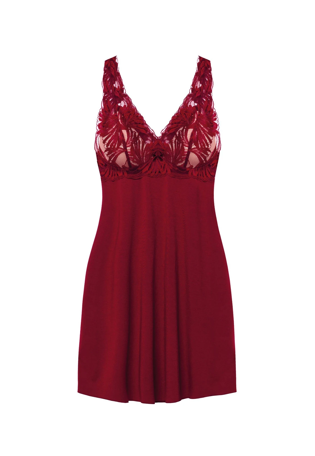 Koronkowa koszulka nocna Susanne w głębokim odcieniu bordo to propozycja, która łączy zmysłowość z komfortem. Góra koszulki jest ozdobiona delikatną, kwiatową koronką, która nadaje elegancji i podkreśla dekolt. Dzięki szerokim, koronkowym ramiączkom koszulka subtelnie odsłania ramiona, zachowując przy tym stabilność i wygodę.