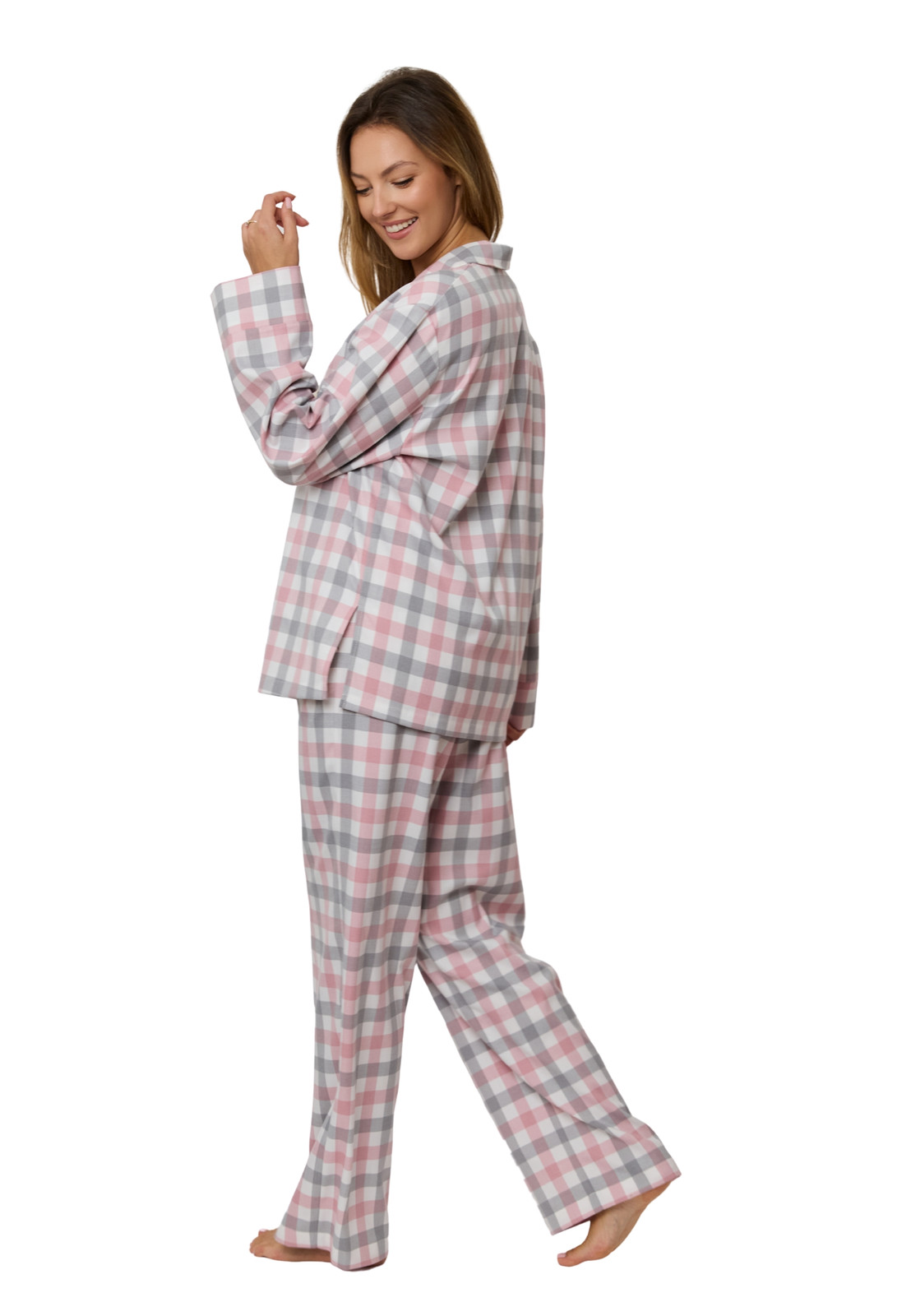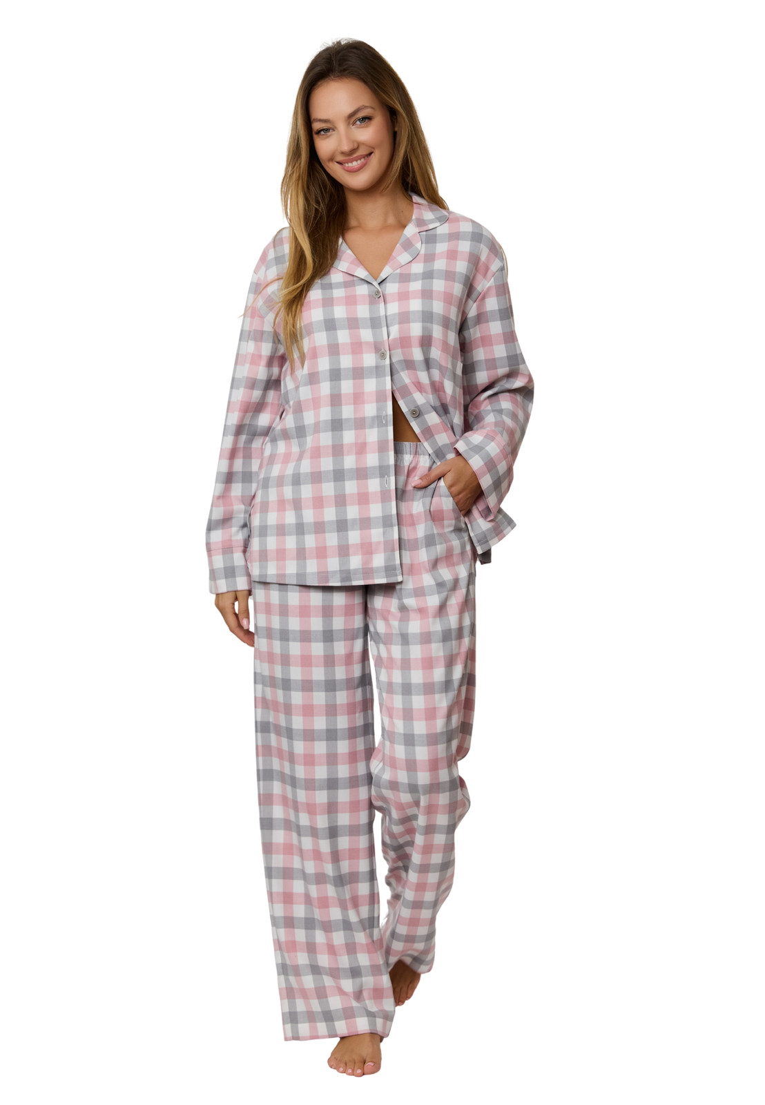 Piżama STELLA to klasyczna, niezwykle przytulna propozycja dla kobiet, które cenią tradycyjny fason, ciepło oraz maksymalny komfort. Wykonana z miękkiej, oddychającej bawełny o strukturze flaneli, idealnie sprawdza się jako piżama damska na jesień i zimę, zapewniając przyjemne otulenie podczas chłodnych wieczorów i poranków. Elegancki kraciasty wzór w odcieniach różu, bieli i szarości nadaje całości ponadczasowego uroku, inspirowanego klasycznymi piżamami koszulowymi.