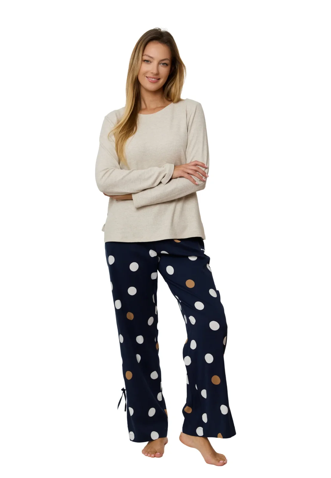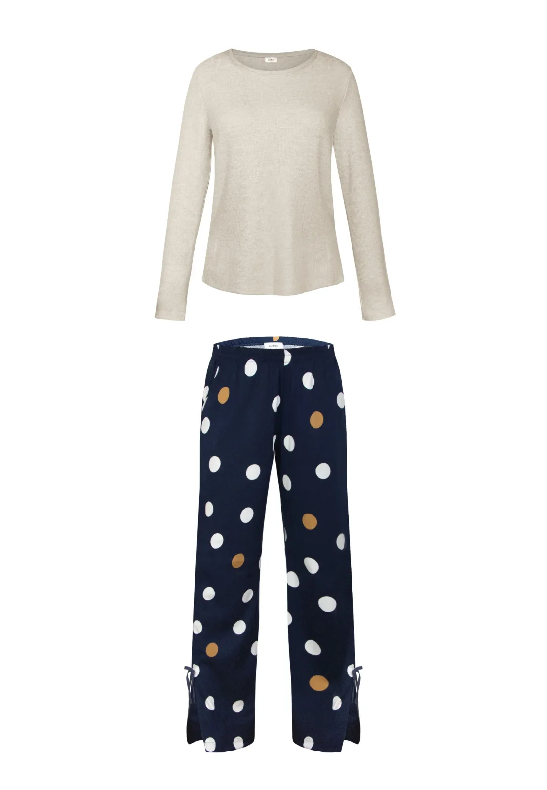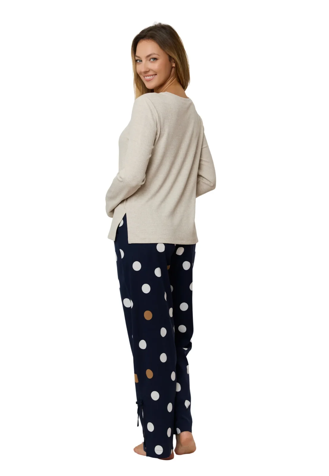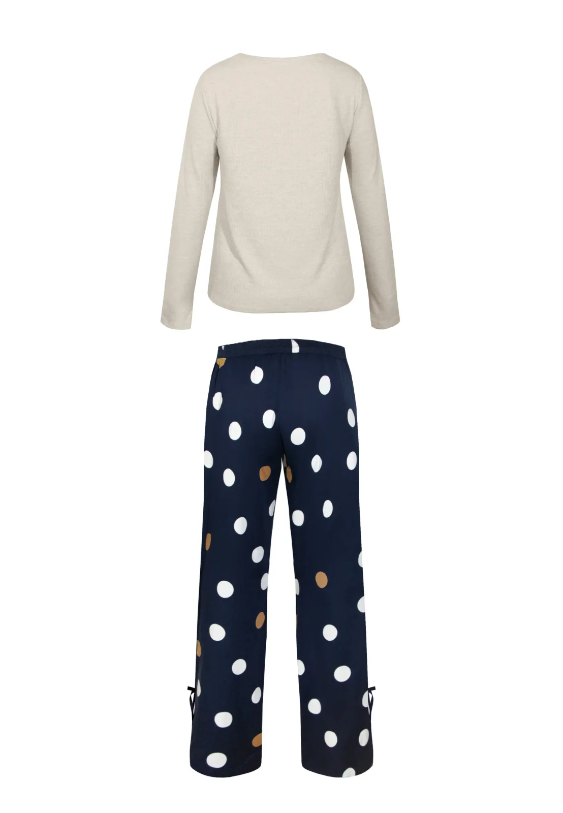 Piżama OCEANE długa marki Mefemi to doskonałe połączenie klasycznego stylu, wygody i naturalnych tkanin. Komplet składa się z beżowej bluzki z długim rękawem wykonanej z miękkiej, oddychającej wiskozy oraz długich spodni z delikatnej tkaniny w granatowym kolorze ozdobionej dużymi, kontrastowymi groszkami w białym i karmelowym odcieniu.