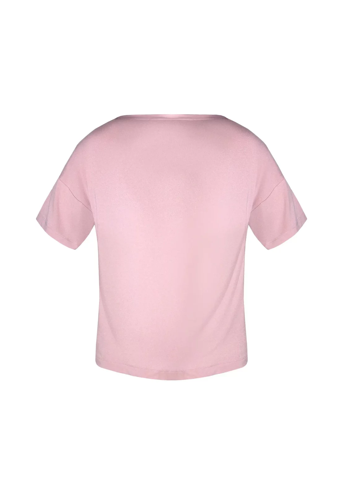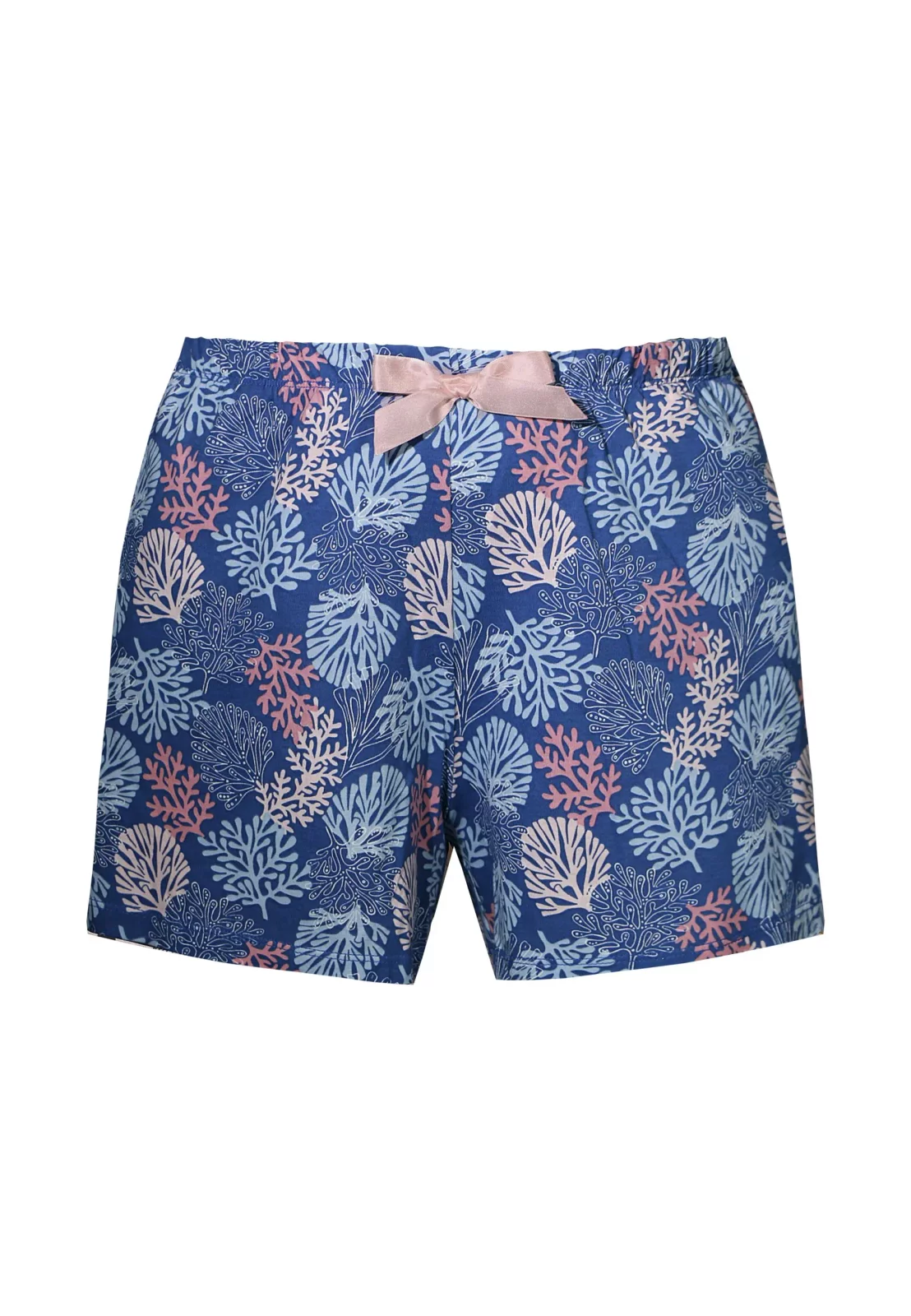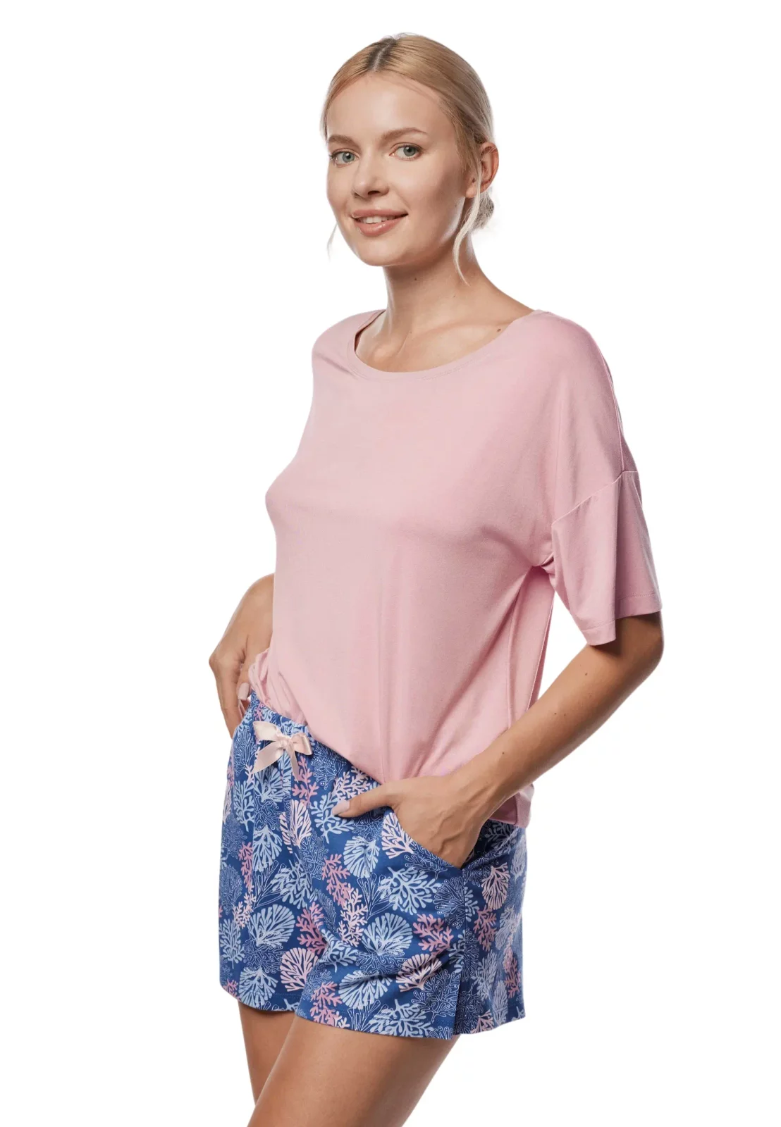 Przygotowany przez nas komplet łączy w sobie zalety praktyczne z ciekawym stylem. Piżama damska z wiskozy składa się z oversizowej, gładkiej bluzki oraz krótkich, wzorzystych spodenek. Dostępny w naszym sklepie zestaw bielizny nocnej podkreśli zatem Twój styl.