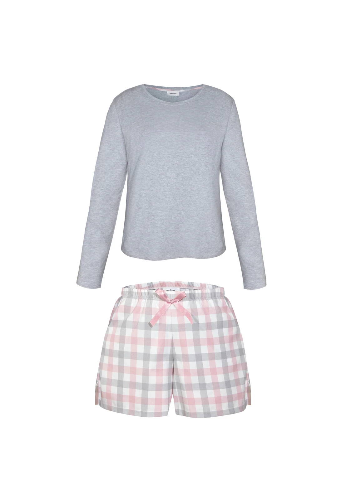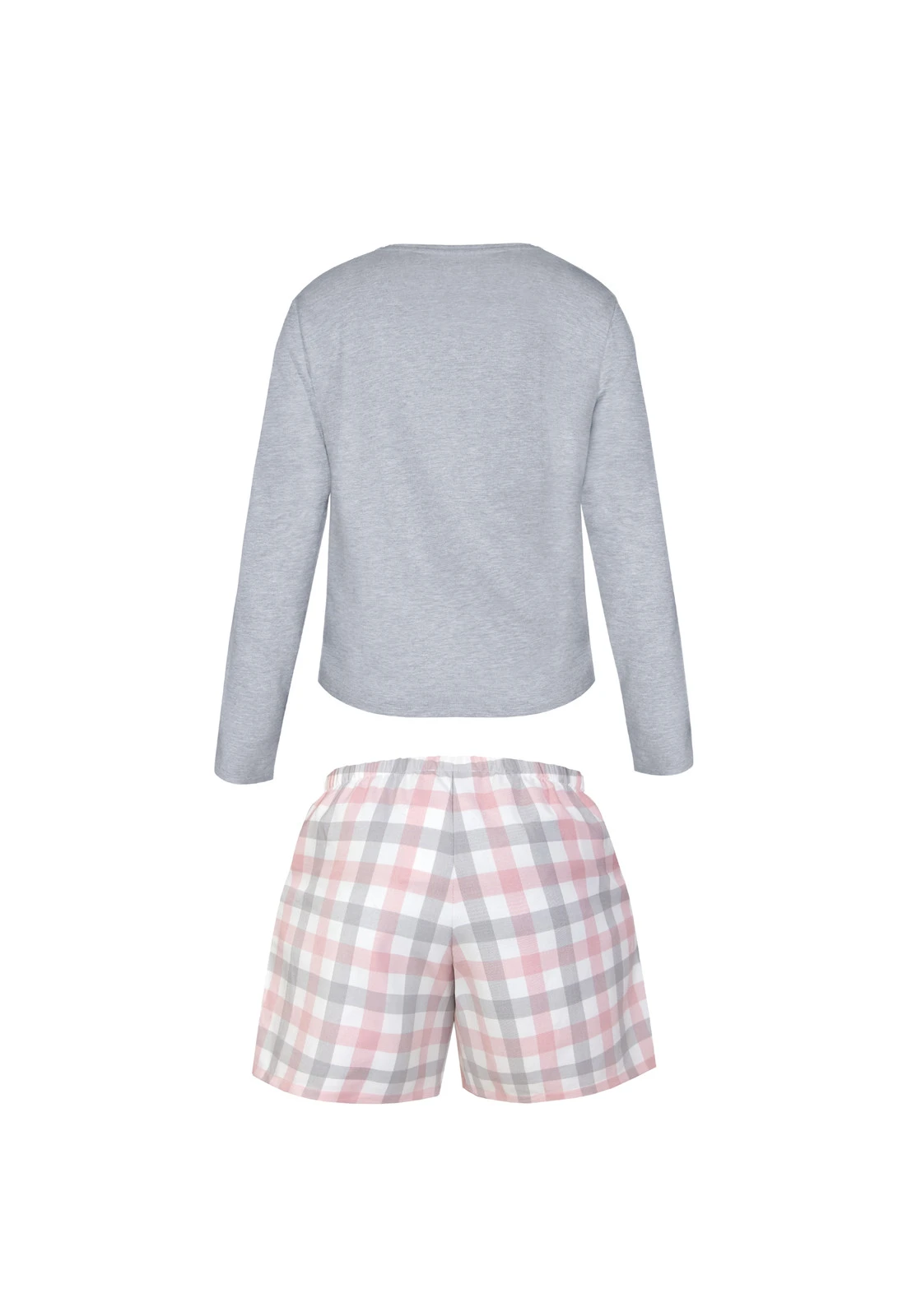 Piżama bawełniana Stella marki Mefemi to uroczy, wygodny i ponadczasowy komplet stworzony z myślą o kobietach ceniących naturalne tkaniny i klasyczny domowy komfort. Delikatna, szara bluzka z długim rękawem wykonana z miękkiej bawełny idealnie dopasowuje się do sylwetki, zapewniając swobodę ruchów oraz komfort termiczny przez cały rok. Dopełniają ją lekkie krótkie spodenki w różowo-szarej kratce, uszyte z wysokogatunkowej bawełny o gładkim, przyjemnym w dotyku wykończeniu.