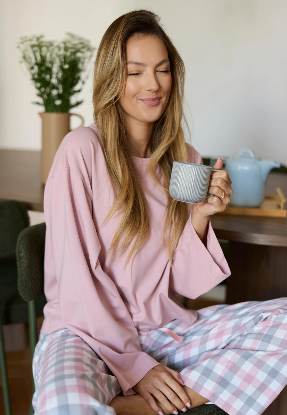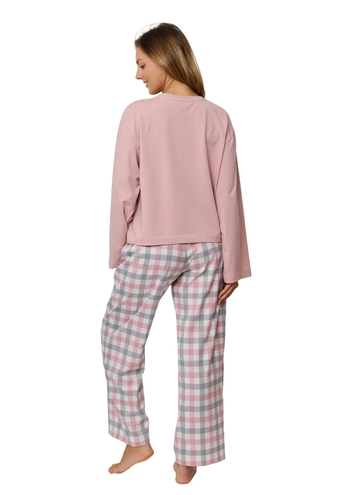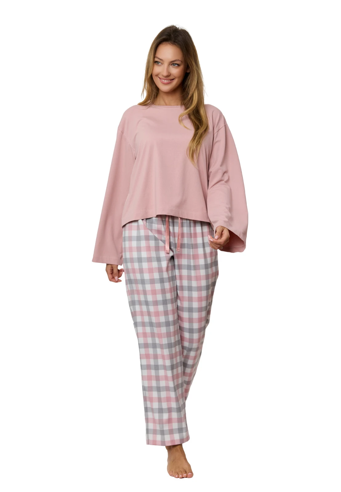 Piżama Stella marki Mefemi to idealny wybór dla kobiet, które jesienią i zimą stawiają na ciepło, miękkość i komfort. Ten długi komplet do spania łączy przyjemną w dotyku bluzkę z szerokimi rękawami w odcieniu pudrowego różu oraz spodnie w klasyczną kratkę w pastelowej palecie. To doskonałe połączenie stylu homewear z codzienną wygodą — zarówno do spania, jak i relaksu w domu.