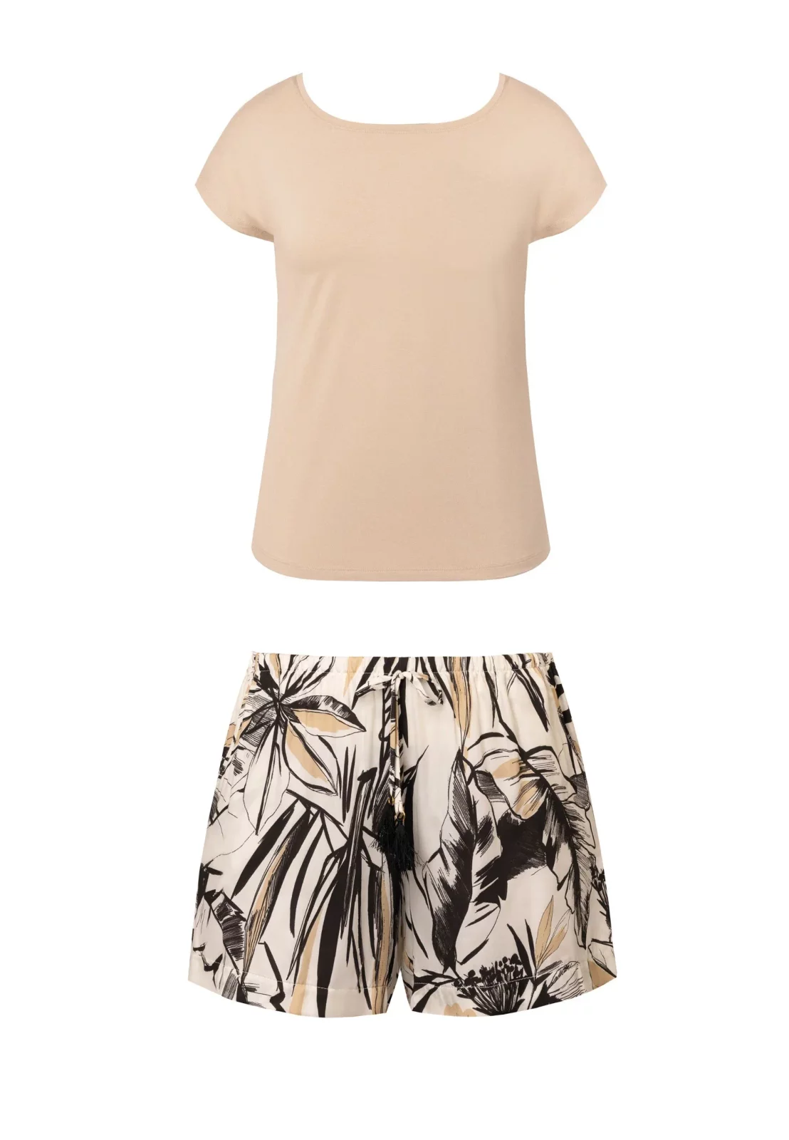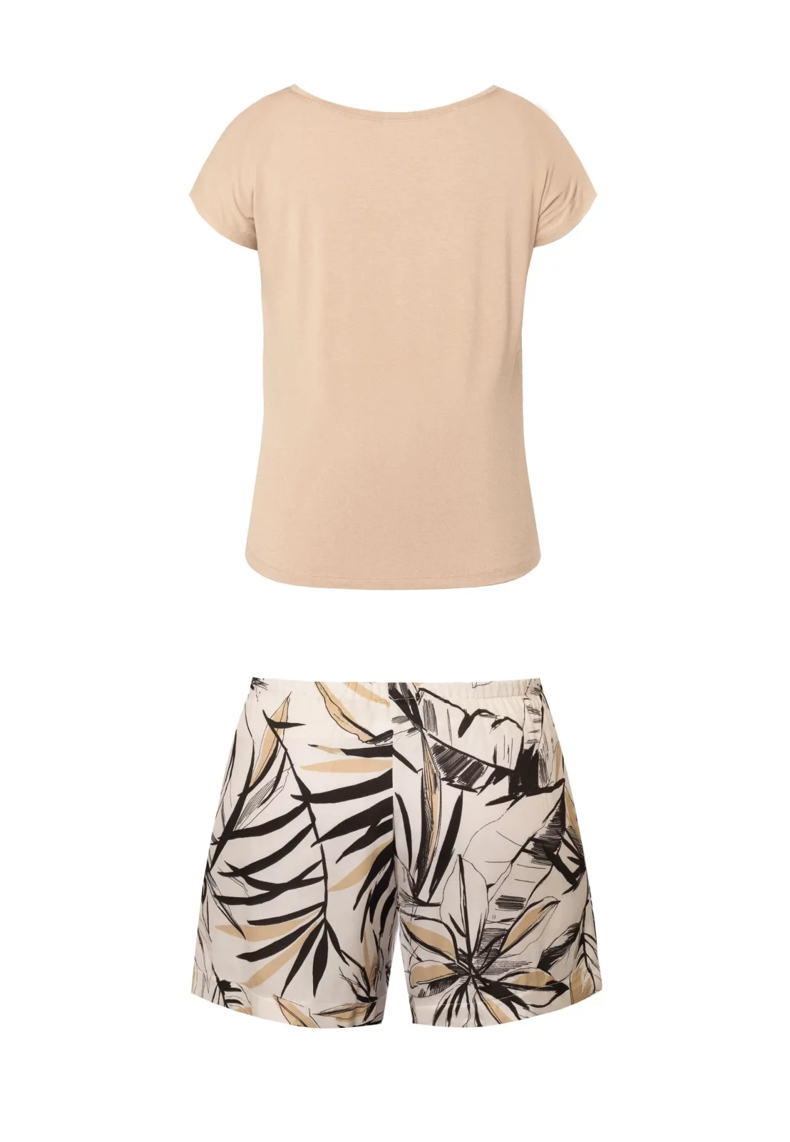 Szukasz wygodnej i stylowej piżamy damskiej, która sprawdzi się zarówno latem, jak i przez cały rok? Piżama Angela marki Mefemi to doskonały wybór dla kobiet ceniących komfort i elegancję. Komplet składa się z beżowej bluzki z krótkim rękawem oraz lekkich szortów z modnym, roślinnym nadrukiem. To idealna piżama dwuczęściowa na ciepłe noce i leniwe poranki.