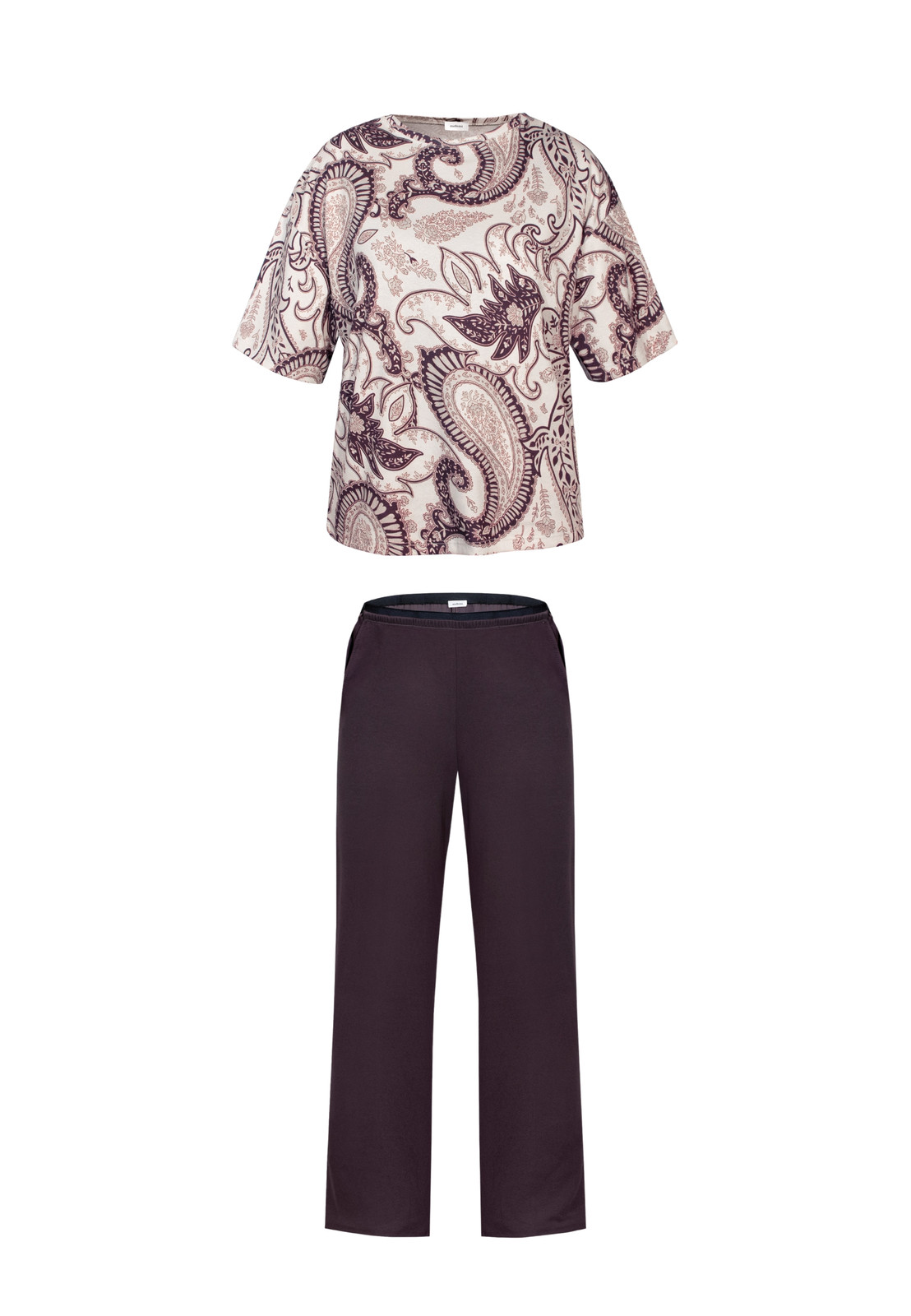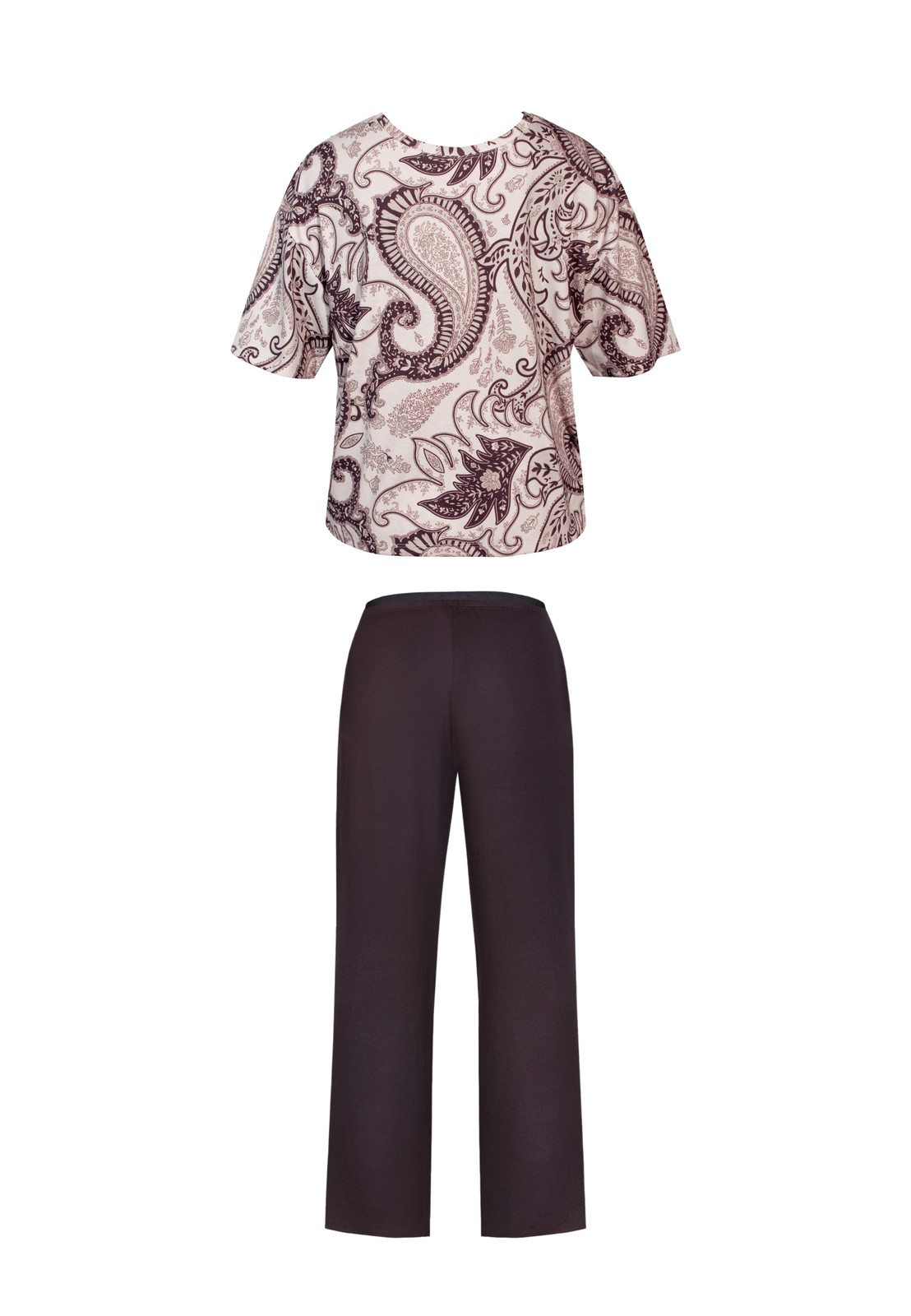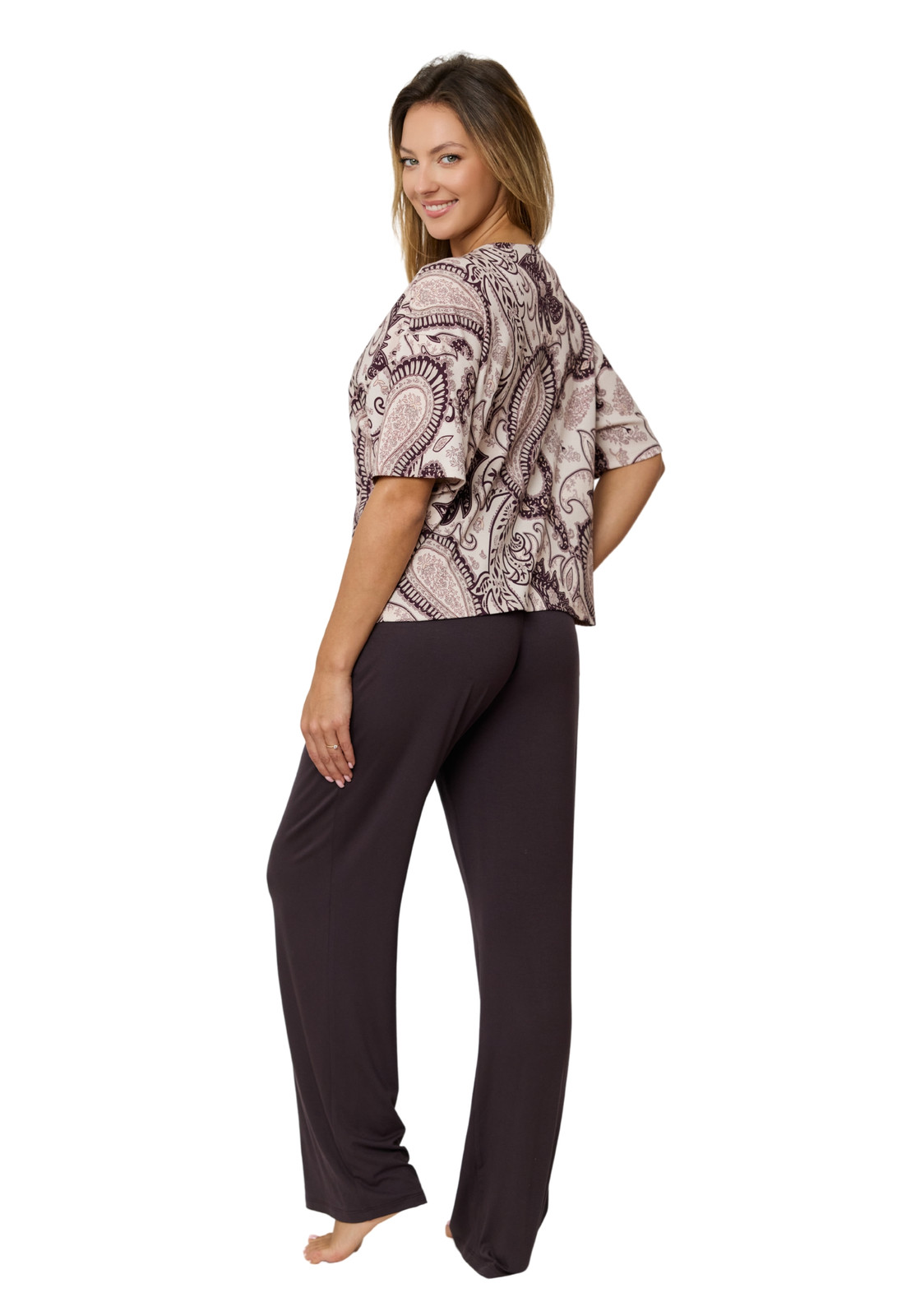 Długie, gładkie spodnie w głębokim odcieniu brązu tworzą harmonijny kontrast z bogato zdobioną górą. Miękka, oddychająca dzianina gwarantuje pełen komfort snu oraz swobodę ruchów – zarówno podczas nocnego wypoczynku, jak i domowego relaksu. Elastyczna talia sprawia, że spodnie idealnie dopasowują się do ciała, oferując wygodę na poziomie homewear premium.