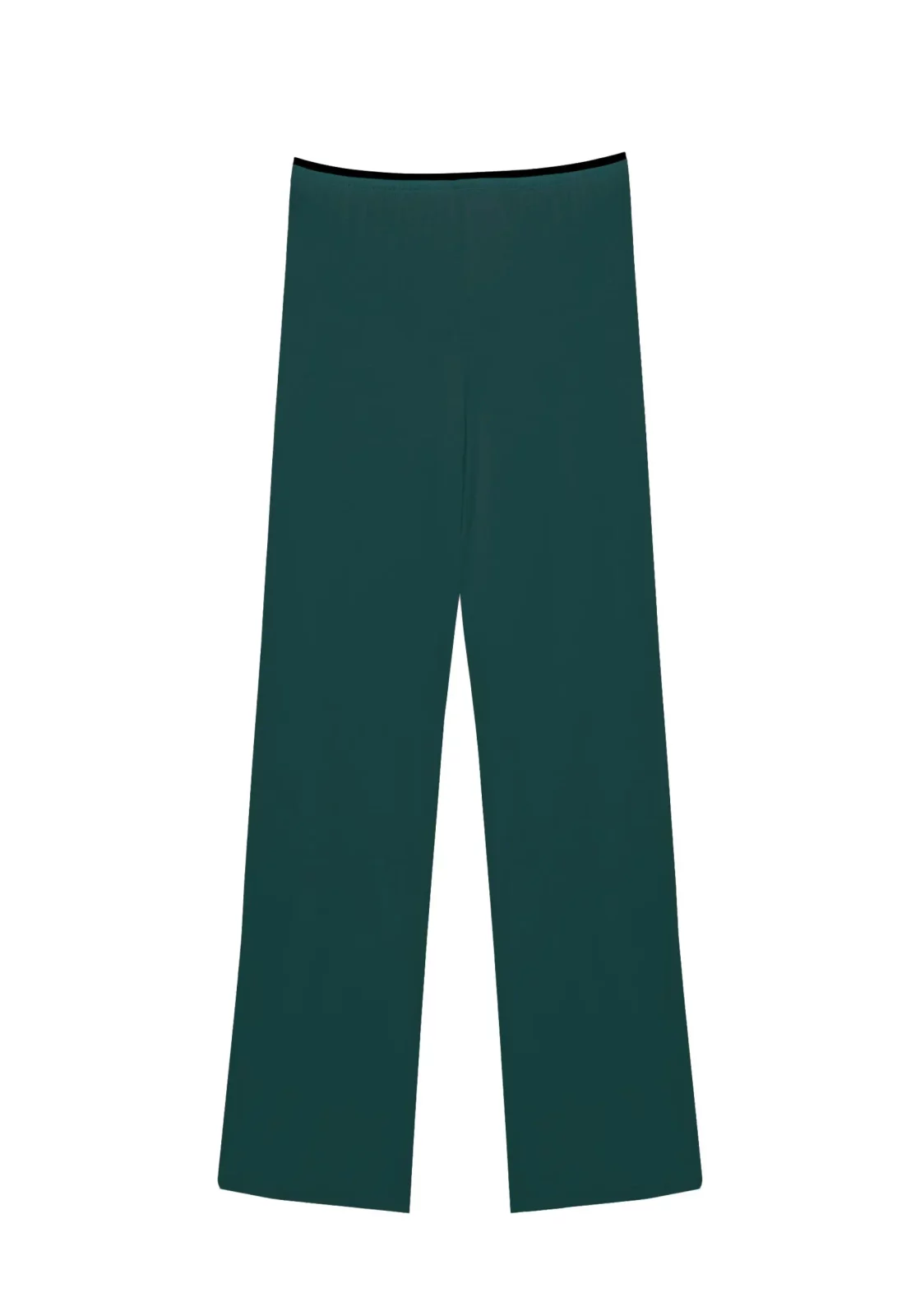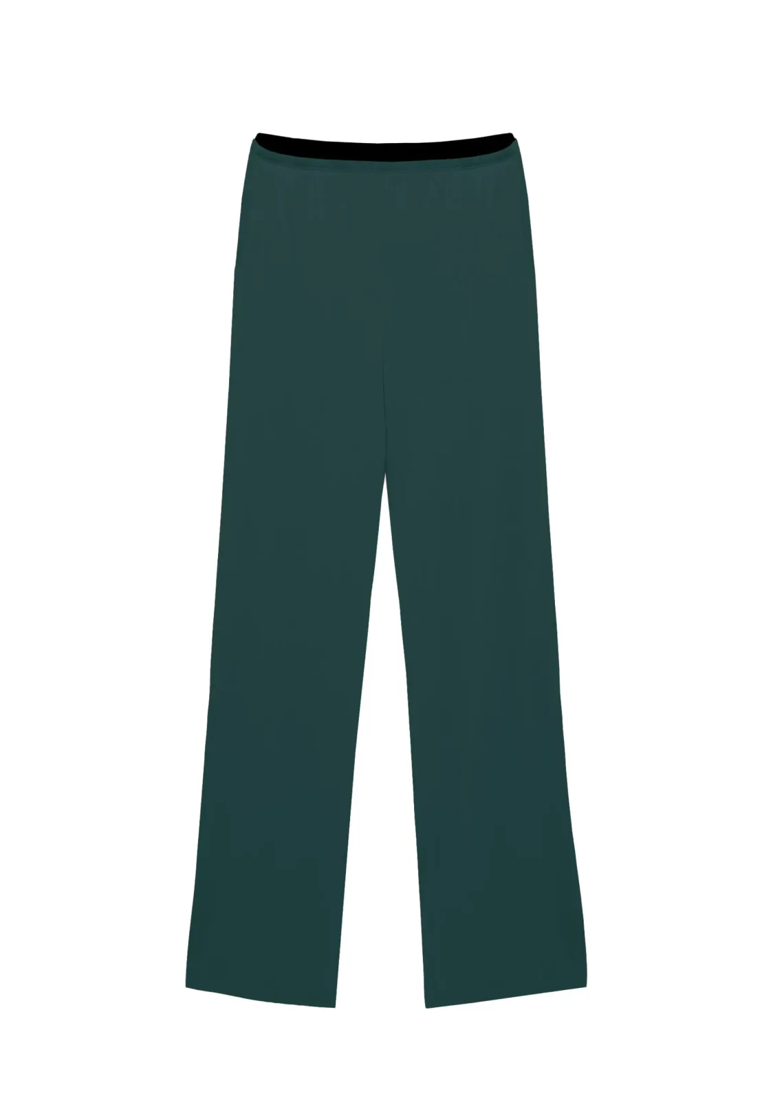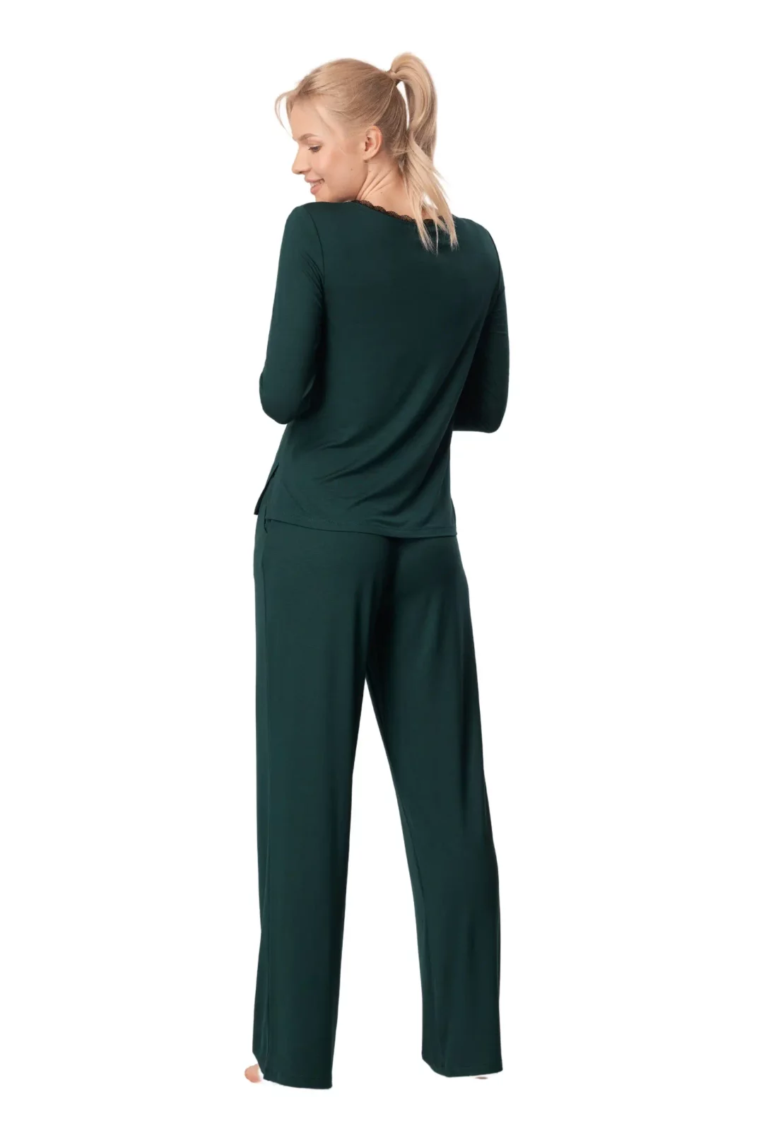 Wykonane z wysokiej jakości wiskozy, charakteryzują się miękkością, delikatnością oraz doskonałym dopasowaniem do sylwetki. Wiskoza to materiał oddychający, który zapewnia uczucie świeżości oraz doskonałą cyrkulację powietrza, dzięki czemu te spodnie idealnie sprawdzą się zarówno w chłodniejsze, jak i cieplejsze noce. Klasyczny krój z prostymi nogawkami dodaje subtelnego szyku, a elastyczna talia gwarantuje wygodę noszenia przez całą noc. Ciemnozielony kolor spodni sprawia, że wyglądają elegancko i stylowo, stanowiąc idealny wybór dla osób ceniących połączenie estetyki i funkcjonalności.