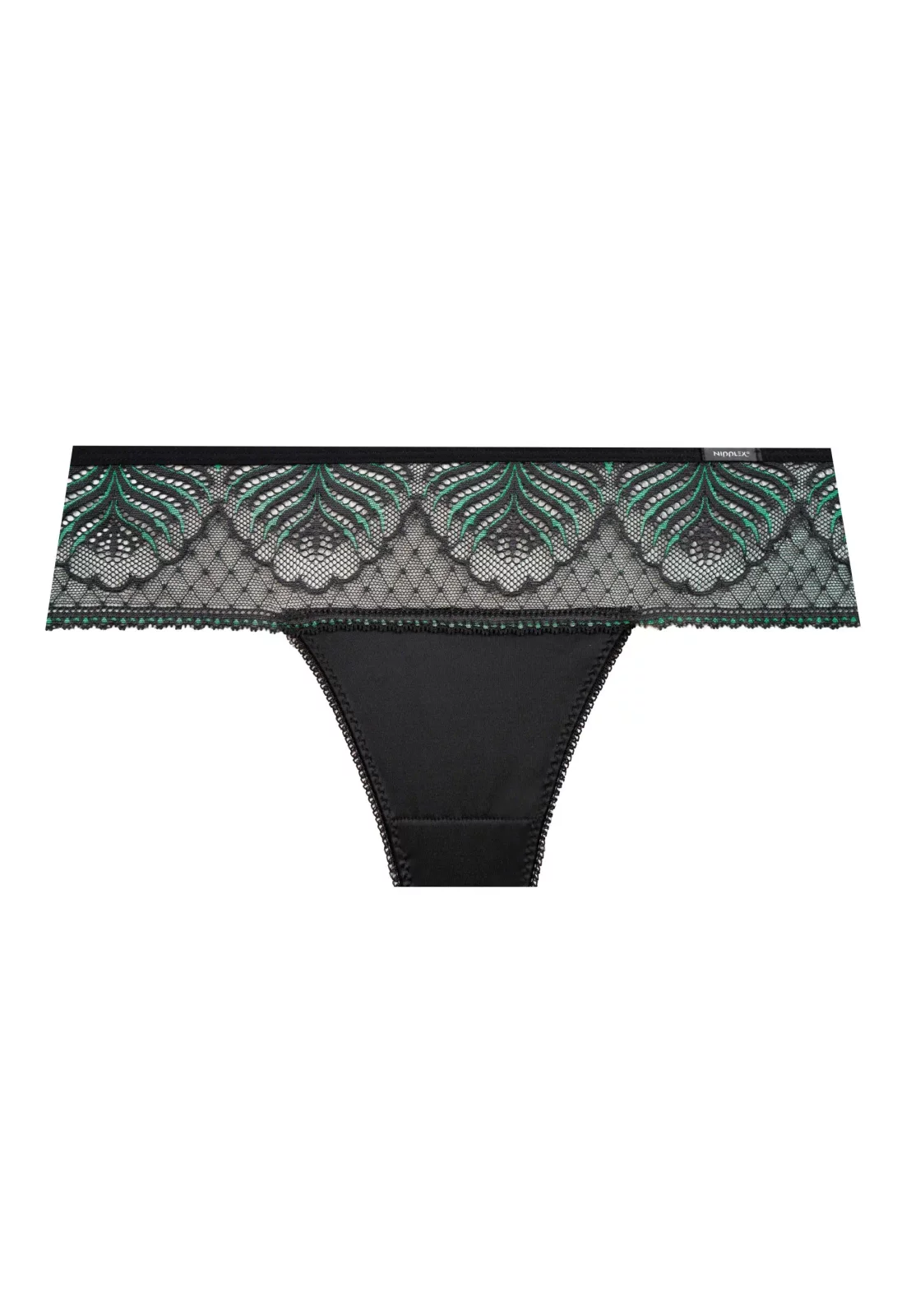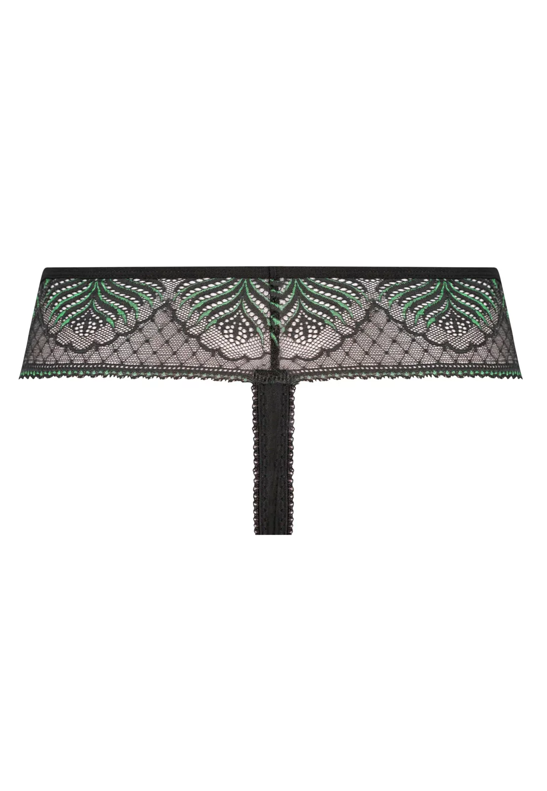 Przód stringów wyróżnia się subtelnym, ale efektownym koronkowym zdobieniem o motywie pawi, które nadaje modelowi wyrafinowanego charakteru. Koronka w kolorach czerni i zieleni jest jednocześnie delikatna i wyrazista, co sprawia, że stringi Diana są niezwykle oryginalne. Tył modelu został zaprojektowany z ozdobnym paskiem, który podkreśla ich kobiecy i zmysłowy charakter.