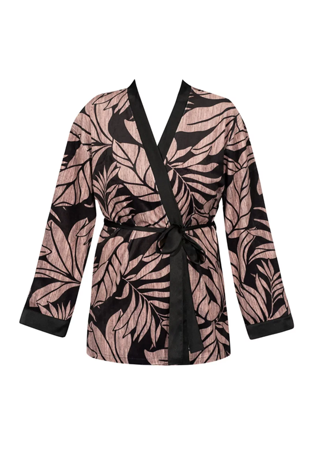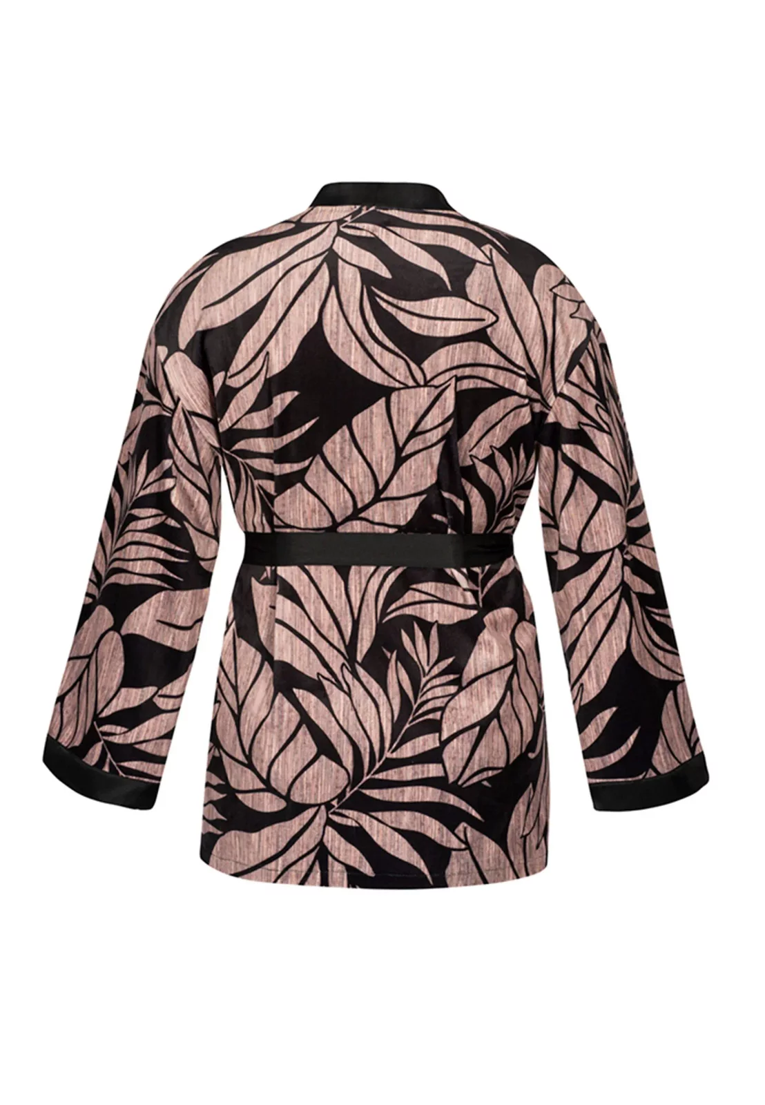 Unikalny wzór liści, łączący odcienie czerni i beżu, nadaje szlafrokowi niepowtarzalnego charakteru. Elegancki krój z paskiem podkreśla talię , a lekkie rozkloszowanie rękawów dodaje stylu i swobody w codziennym użytkowaniu. Idealna długość szlafroka pozwala czuć się komfortowo i jednocześnie kobieco , niezależnie od okazji.