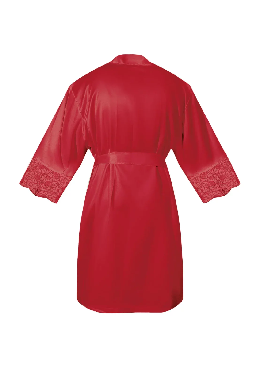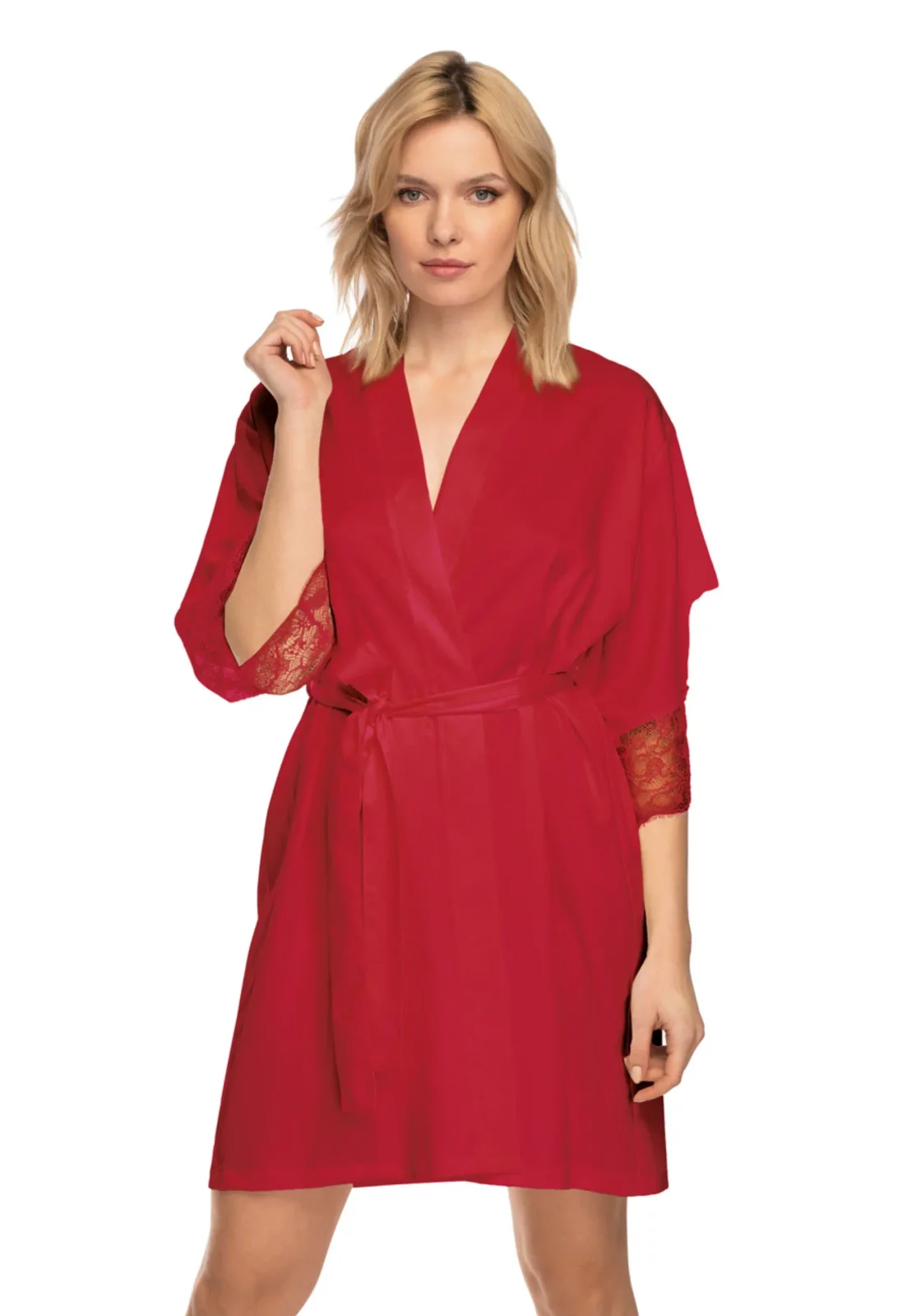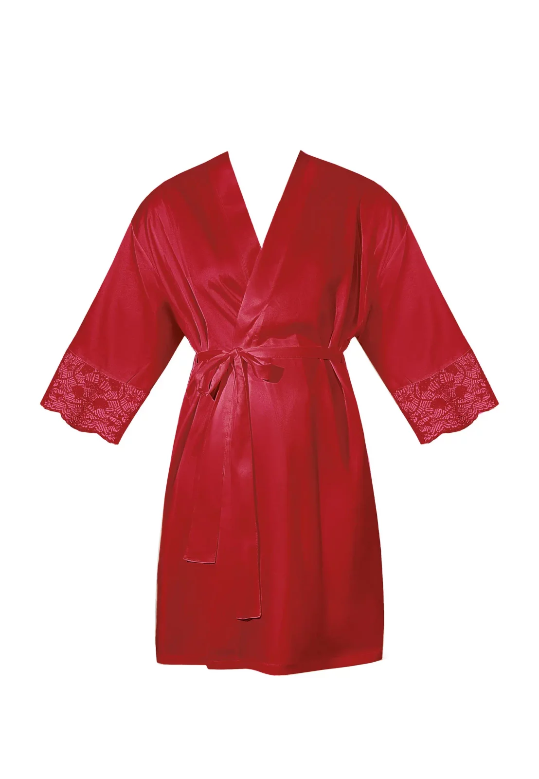 Poczuj luksus na własnej skórze z satynowym szlafrokiem Zora od Mefemi. Ten elegancki szlafrok w głębokim czerwonym kolorze to doskonały wybór dla kobiet, które cenią sobie styl i wygodę. Wykonany z miękkiej i połyskującej satyny, zapewnia wyjątkowy komfort noszenia oraz subtelny efekt glamour. Delikatne koronkowe wykończenia na rękawach dodają mu kobiecego uroku i elegancji.