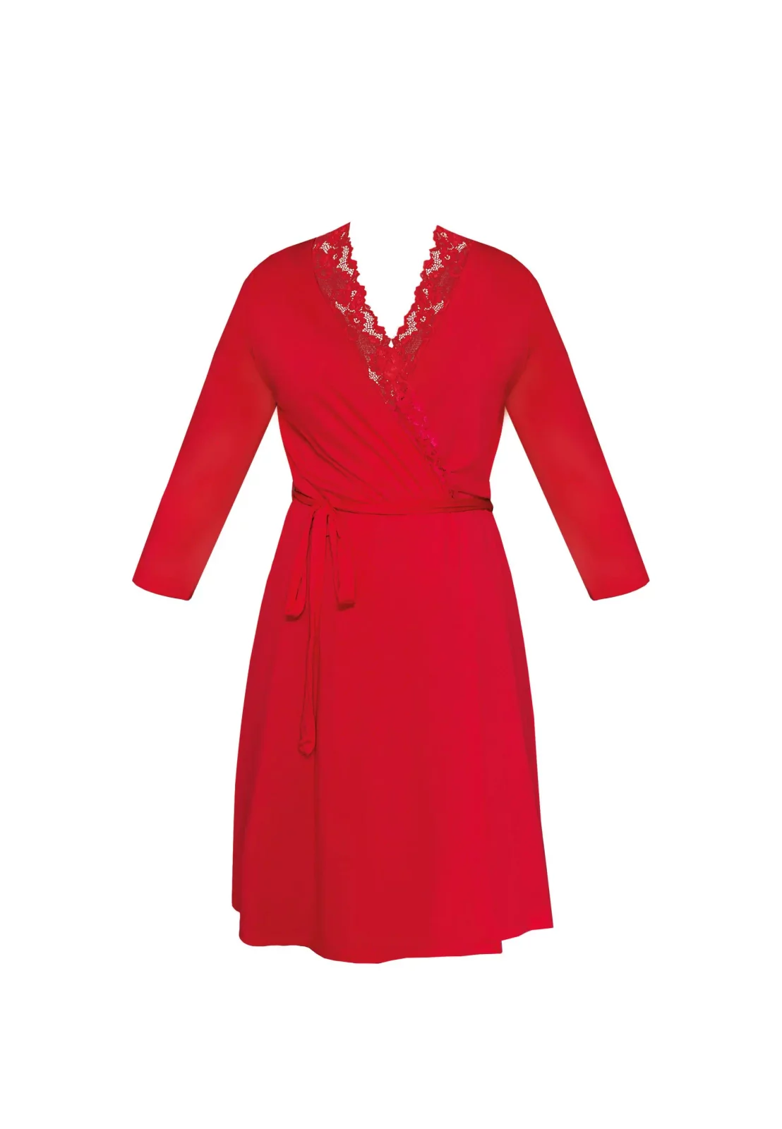Model posiada wiązanie w pasie, które pozwala idealnie dopasować szlafrok do sylwetki. Rękawy o długości 3/4 nadają mu lekkości i sprawiają, że jest to doskonała propozycja na każdą porę roku. Klasyczna długość przed kolano czyni go uniwersalnym wyborem – idealnym zarówno do noszenia w domu, jak i na wyjątkowe okazje, np. poranek ślubny.